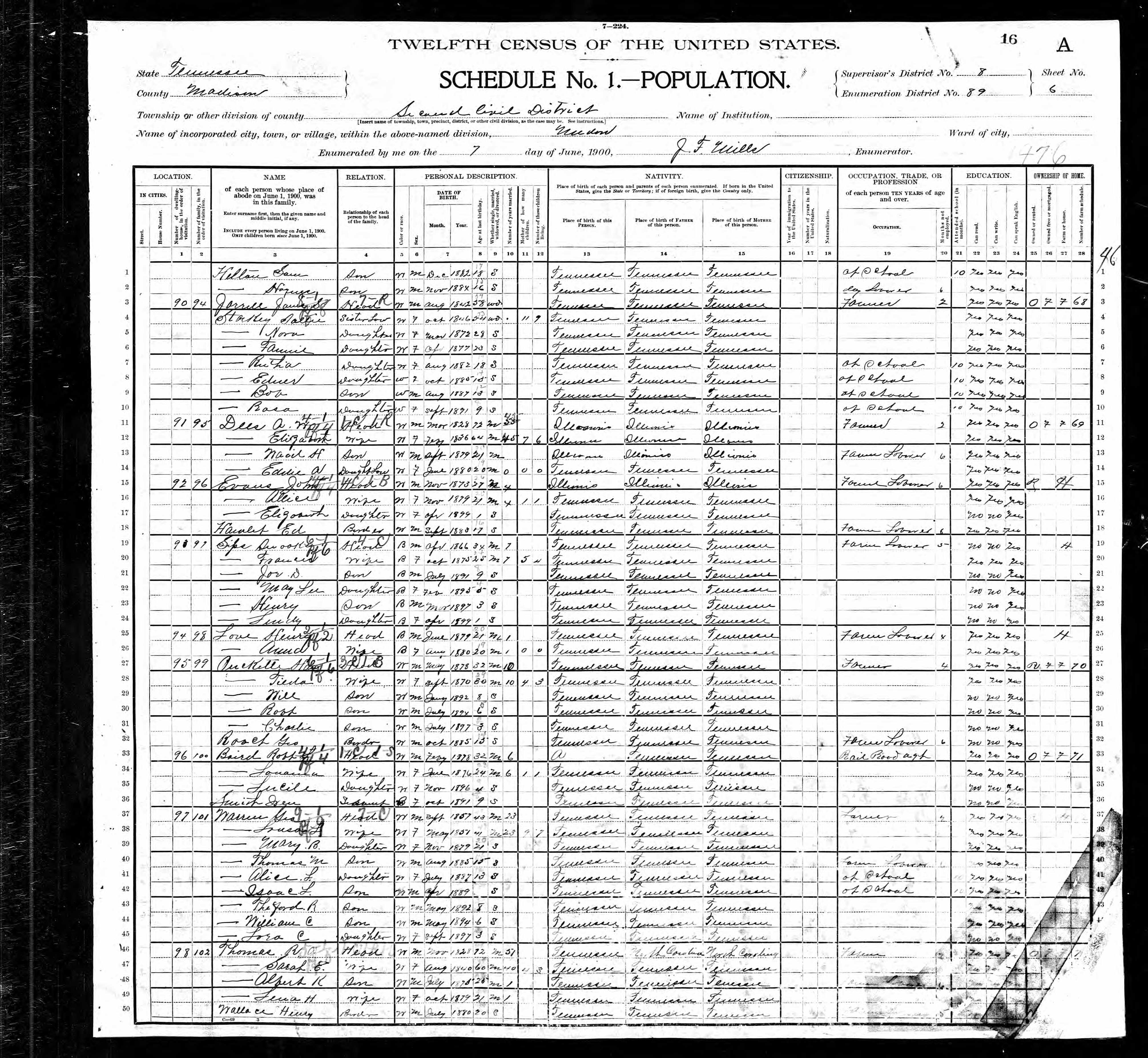 Residences1875 - Madison County, Tennessee | 1880 - Madison, Tennessee 1900 - Madison, Tennessee 1910 - Hardeman, Tennessee 1920 - Hardeman, Tennessee 1926 - Jackson, Madison, Tennessee |
