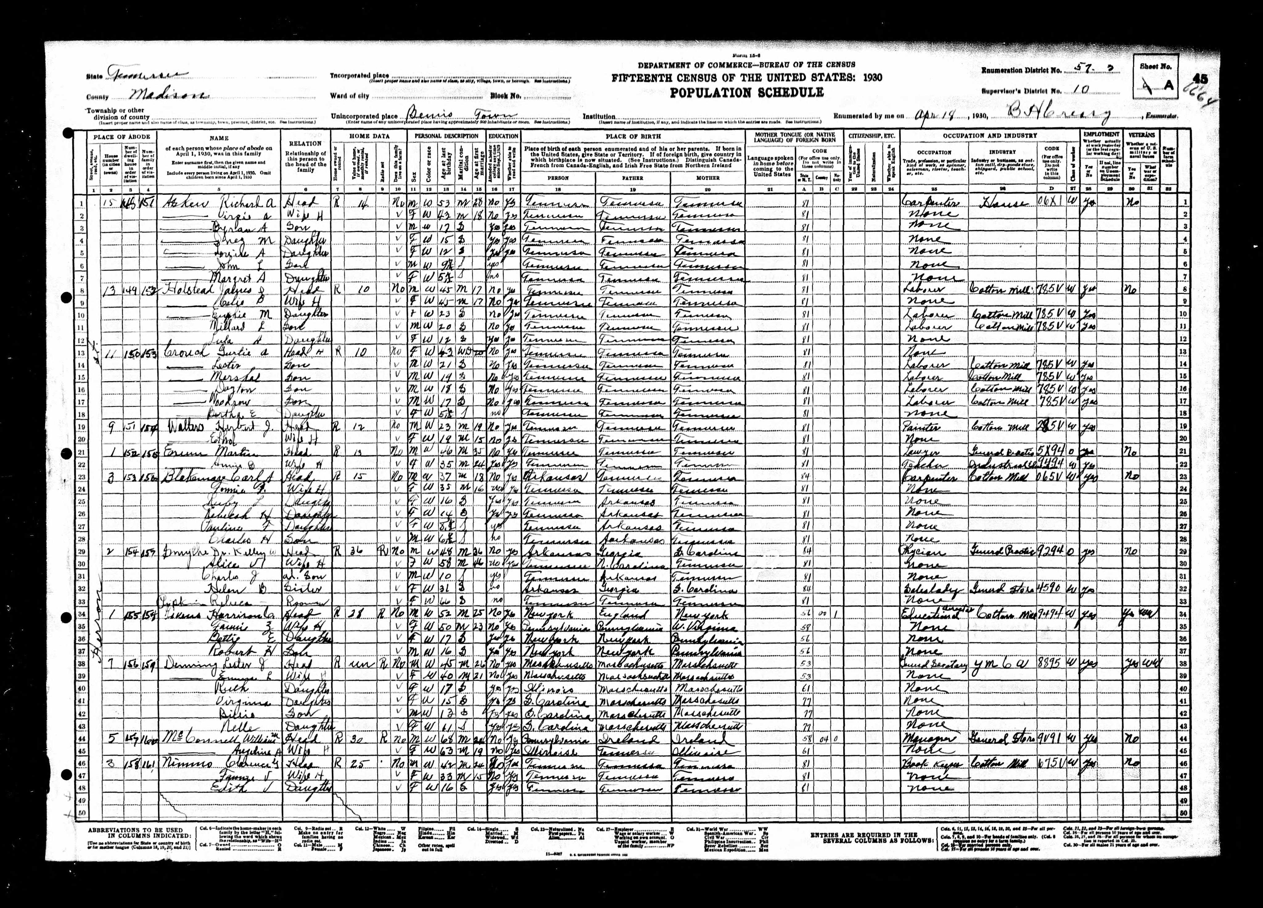 Residences1860 - Madison County, Tennessee | 1880 - Madison, Tennessee 1910 - Madison, Tennessee 1930 - Madison, Tennessee 1940 - Jackson, Madison, Tennessee 1946 - Bolivar, Hardeman, Tennessee |
