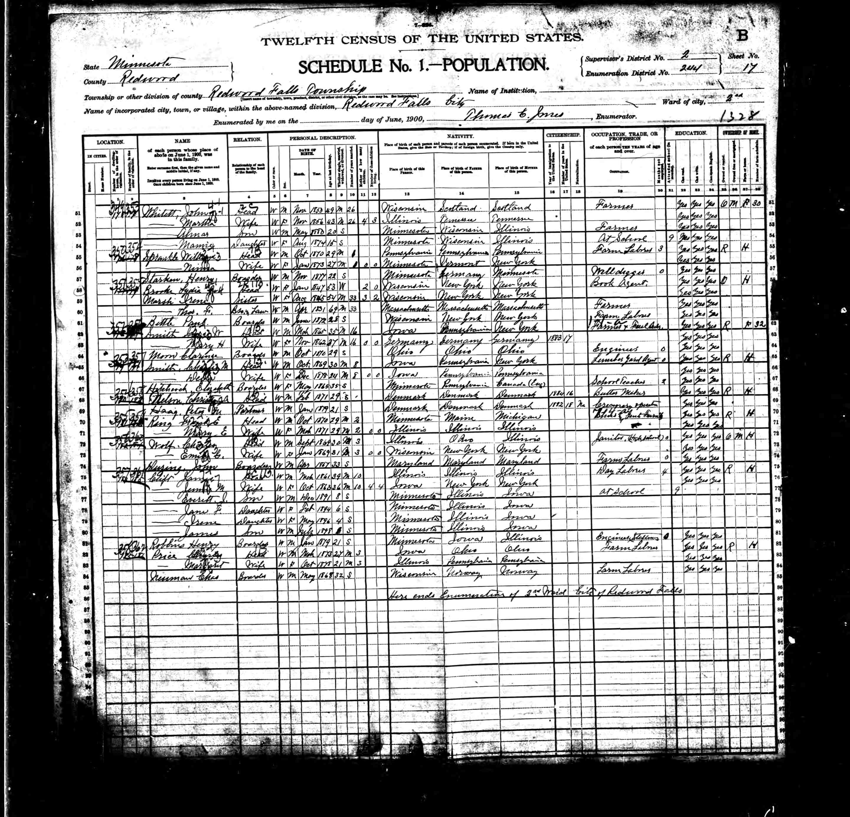 Residences1865 - Minnesota | 1870 - Redwood Falls, Redwood, Minnesota 1880 - Redwood Falls, Redwood, Minnesota 1900 - Redwood Falls, Redwood, Minnesota |