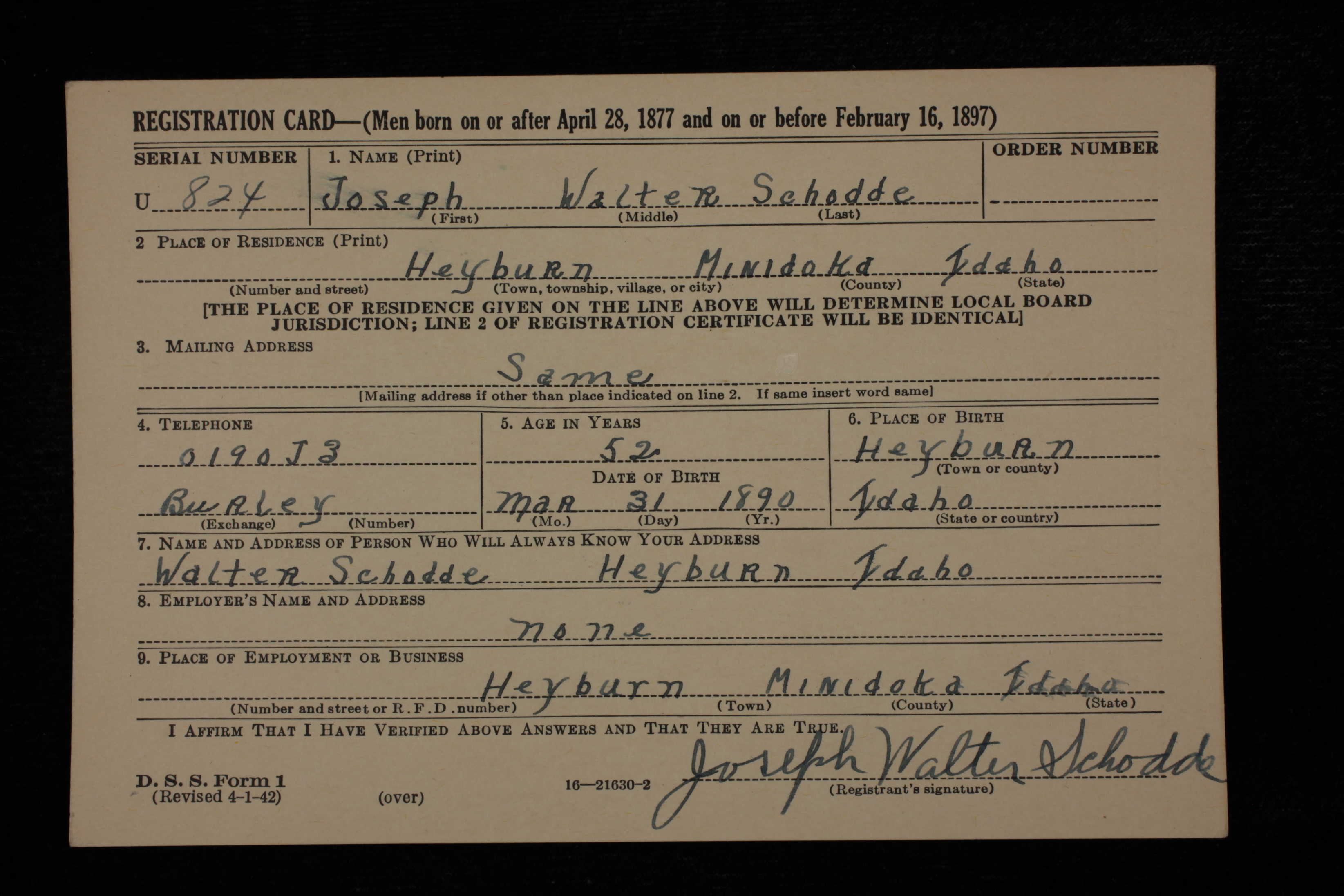 Residences1894 - Lawrence County, South Dakota | 1900 - Terry, Lawrence, South Dakota 1910 - Heyburn, Lincoln, Idaho 1920 - Venice, Los Angeles, California 1940 - Emerson, Minidoka, Idaho 1985 - Burley, Cassia, Idaho, USA |