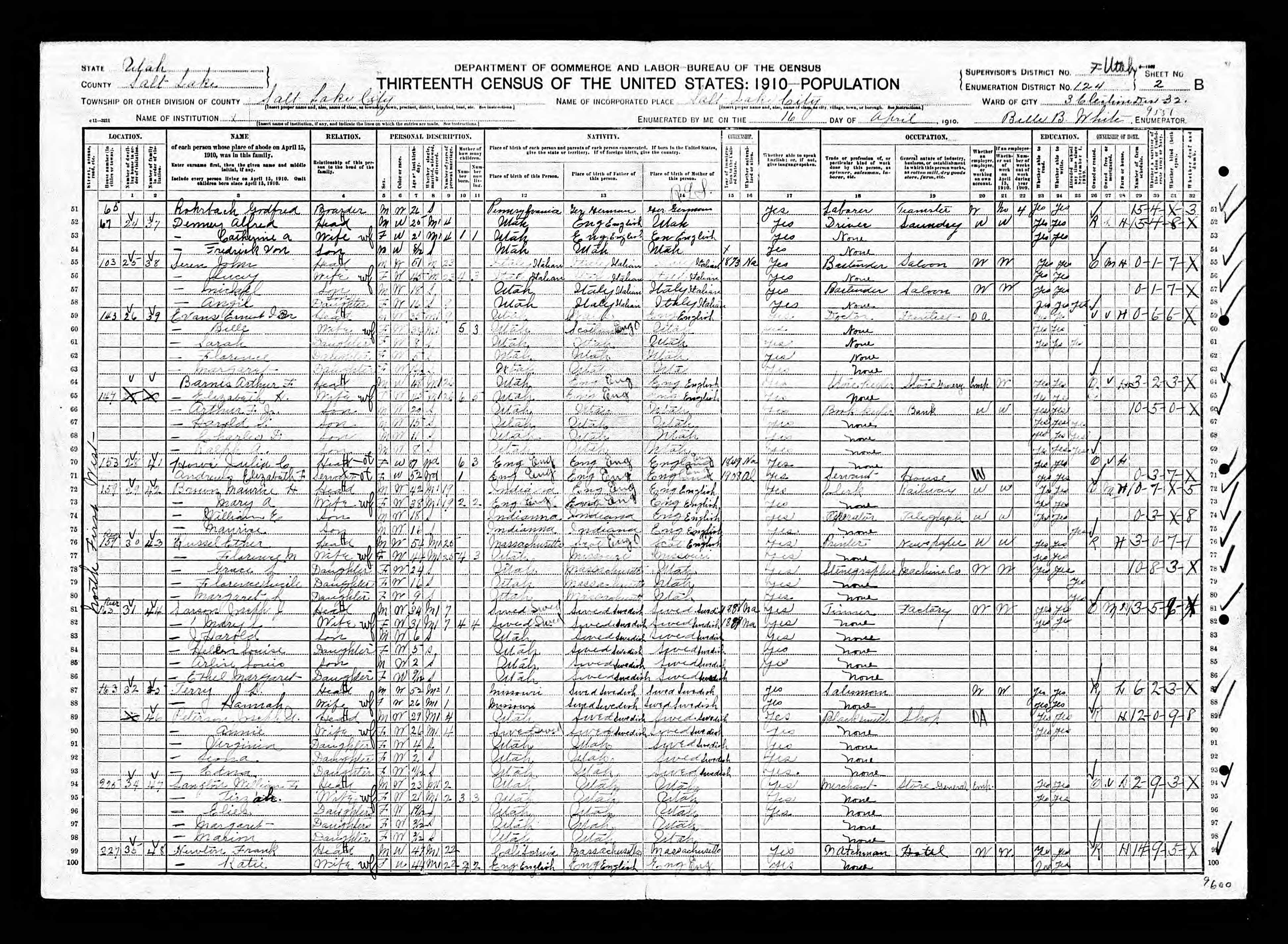 Residences1865 - Salt Lake City, Salt Lake, Utah | 1870 - Salt Lake City, Salt Lake, Utah 1880 - Salt Lake City, Salt Lake, Utah 1900 - Salt Lake City, Salt Lake, Utah | 1910 - Salt Lake City, Salt Lake, Utah | 1920 - Salt Lake City, Salt Lake, Utah 1930 - Salt Lake City, Salt Lake, Utah 1936 - Salt Lake City, Salt Lake, Utah |