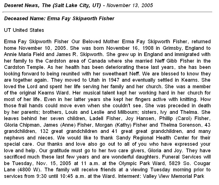 Residences1908 - Magrath, Alberta, Canada | 1968 - Granger, Salt Lake, Utah |