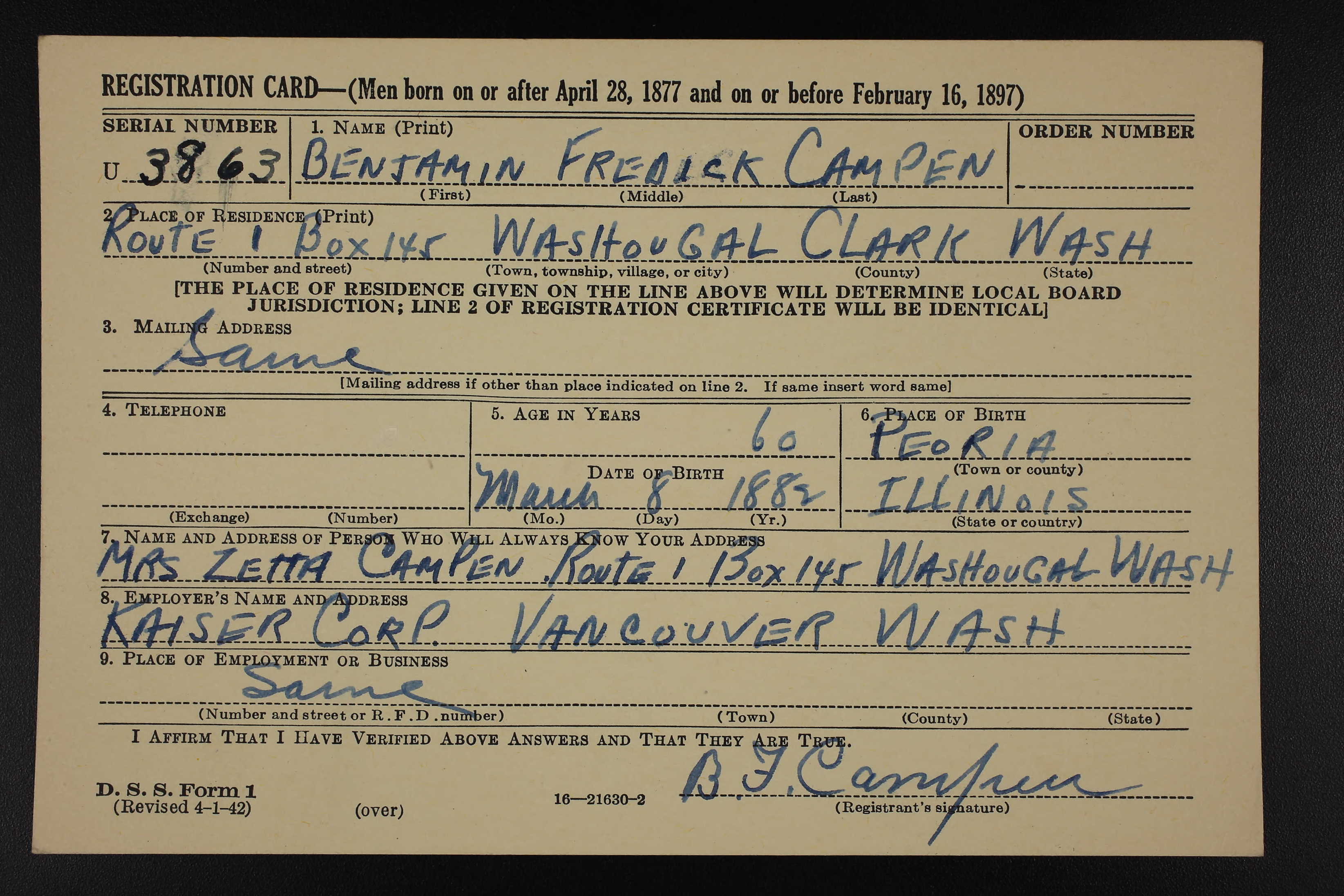 Residences1886 - Washougal, Clark, Washington | 1900 - Cape Horn, Skamania, Washngton 1910 - Washougal, Clark, Washngton 1920 - Gibbons, Clark, Washngton 1930 - Gibbons, Clark, Washngton 1940 - Gibbons, Clark, Washngton 1970 - Vancouver, Clark, Washington |