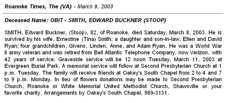 Residences1920 - Virginia | 1930 - Roanoke, Roanoke, Virginia 1940 - Roanoke, Roanoke City, Virginia 2003 - Roanoke, Roanoke, Virginia |