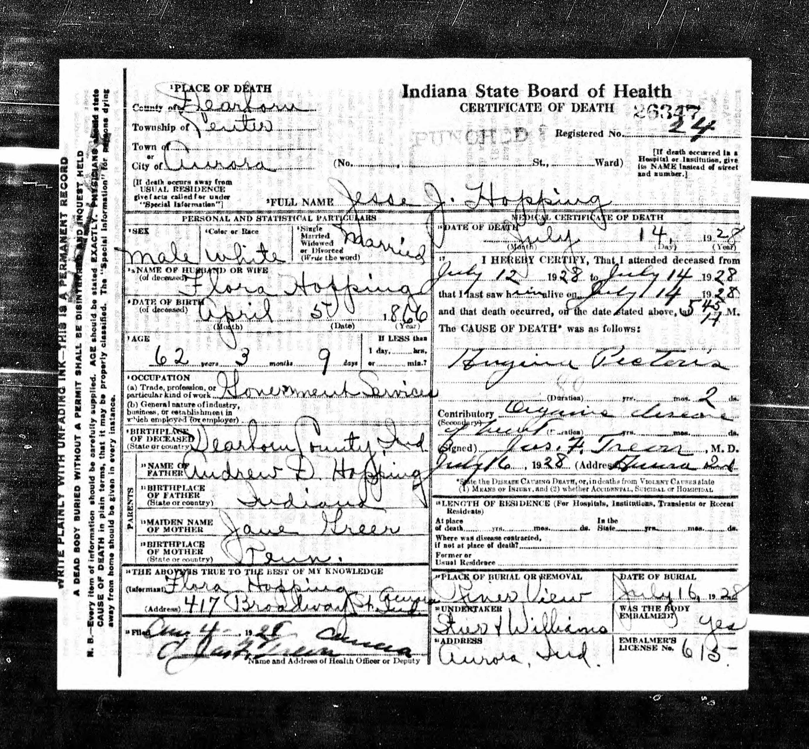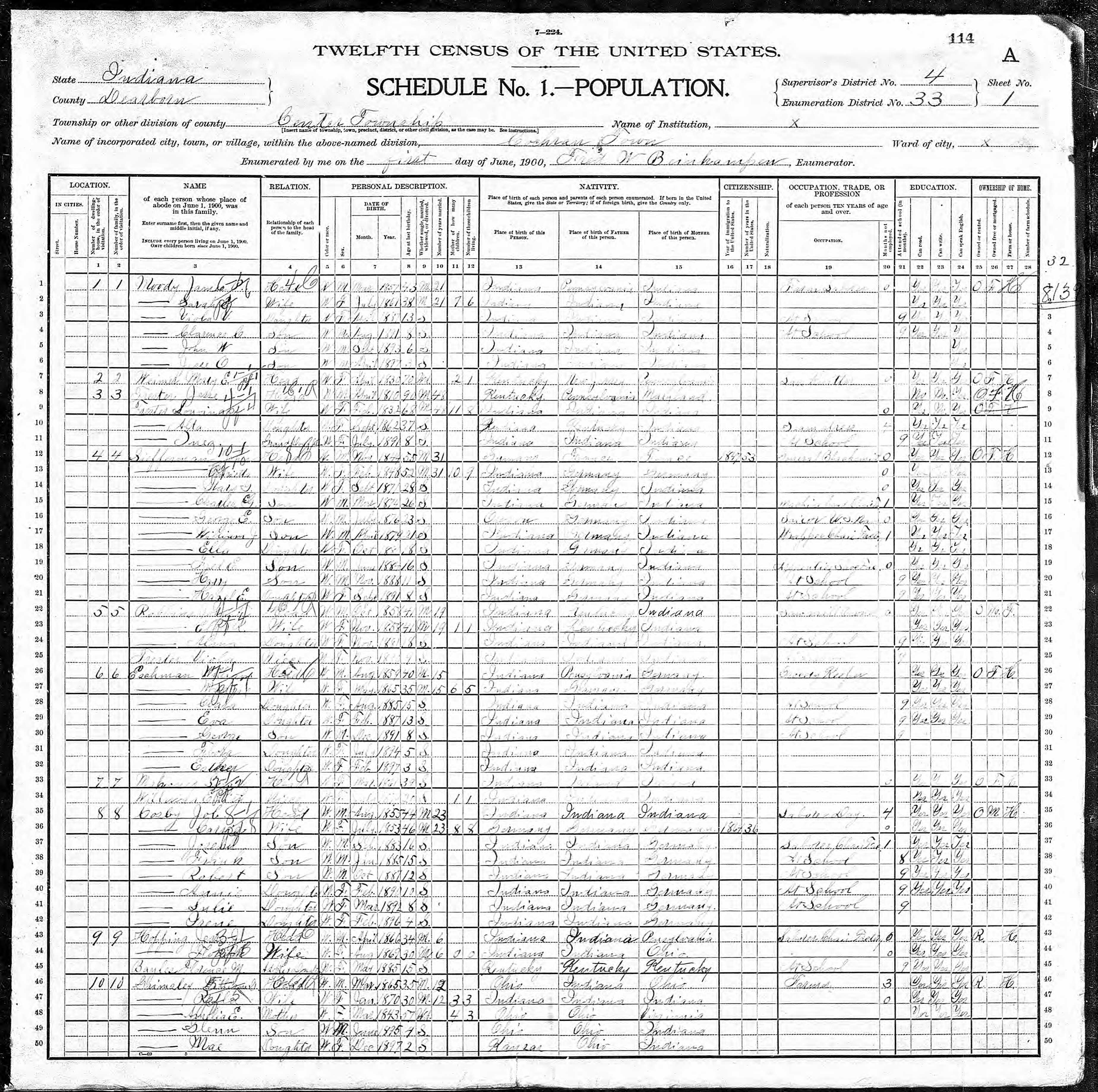 Residences1869 - Aurora, Dearborn, Indiana | 1870 - Cochran, Dearborn, Indiana 1880 - Center, Dearborn, Indiana 1900 - Center, Dearborn, Indiana 1910 - Aurora, Dearborn, Indiana | 1920 - Aurora, Dearborn, Indiana | 1930 - Aurora, Dearborn, Indiana 1940 - Aurora, Dearborn, Indiana 1961 - Brookville, Franklin, Indiana |
