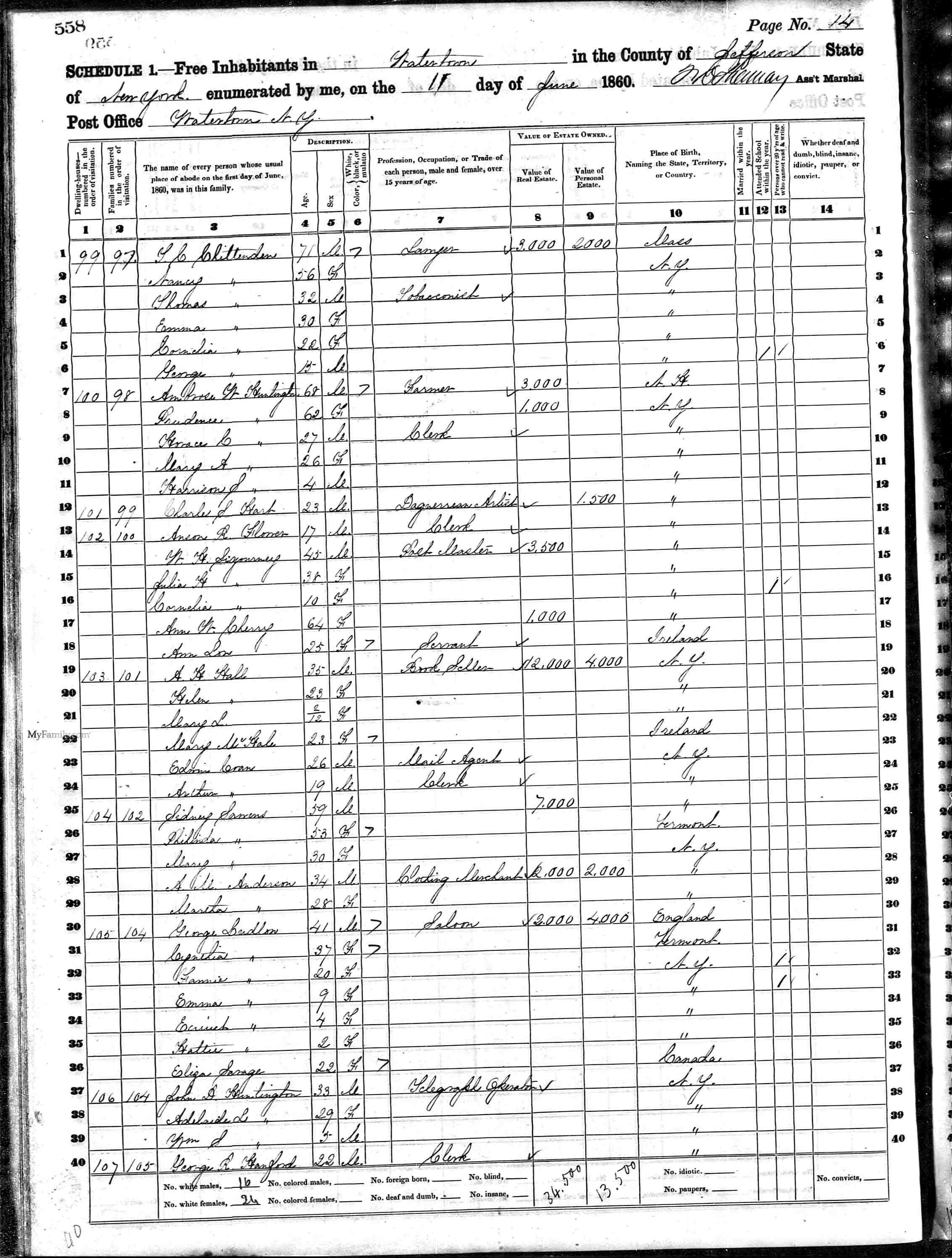 Residences1791 - Grantham, New Hampshire | 1860 - Watertown, Jefferson, New York 1863 - New York |