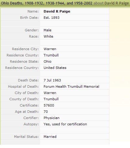 Residences1892 - Wastral, Canada | 1900 - East Orange, Essex, New Jersey 1910 - Warren, Trumbull, Ohio 1930 - Warren, Trumbull, Ohio 1963 - Warren, Ohio |