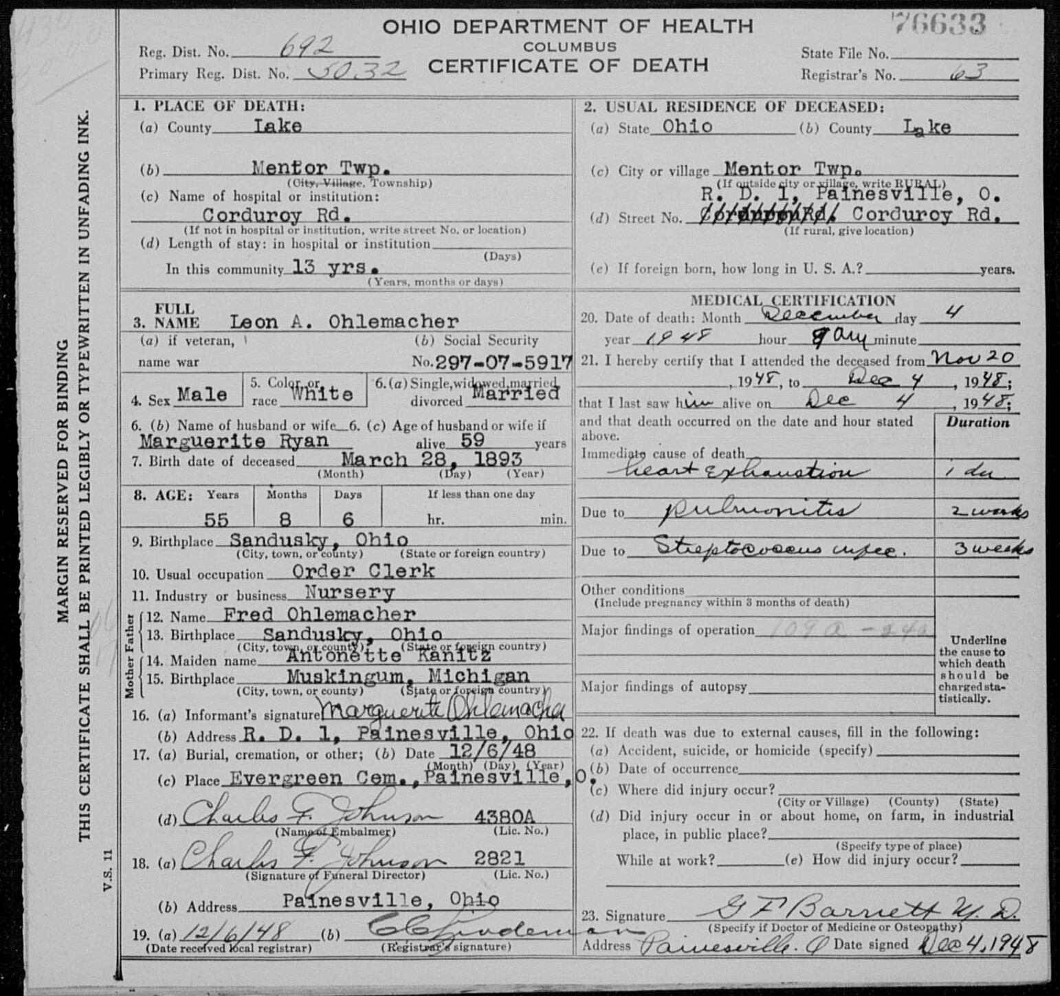 Residences1889 - Indianapolis, Marion, Indiana | 1900 - Indianapolis, Marion, Indiana 1910 - Washington, Marion, Indiana 1920 - Portage, Ottawa, Ohio 1930 - Sandusky, Erie, Ohio 1940 - Mentor, Lake, Ohio 1978 - Grand River, Lake, Ohio, USA |