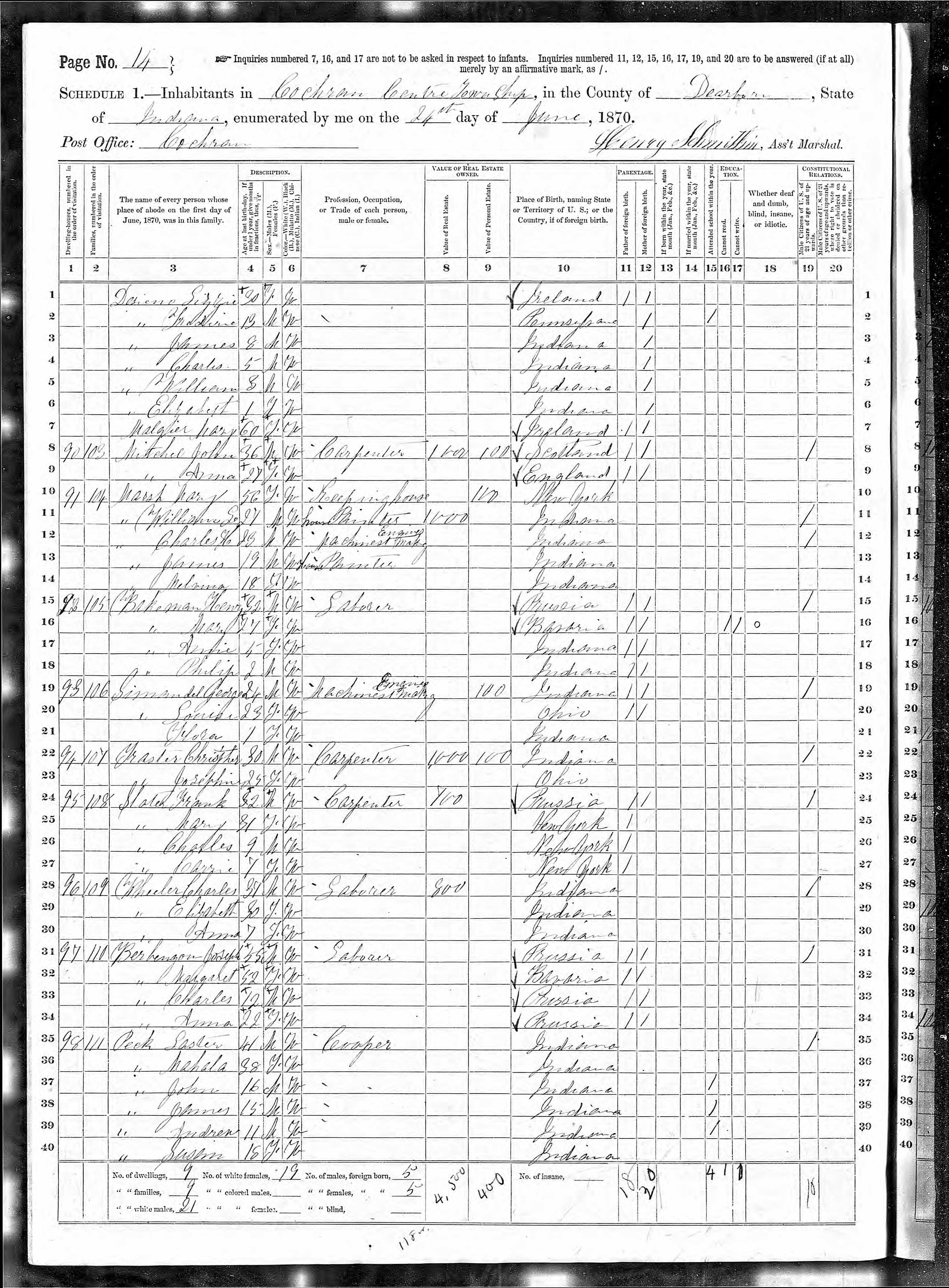 Residences1847 - Center, Dearborn, Indiana | 1860 - Crosby, Hamilton, Ohio 1870 - Cochran, Dearborn, Indiana 1880 - Center, Dearborn, Indiana 1900 - Center, Dearborn, Indiana 1914 - Center, Dearborn, Indiana |