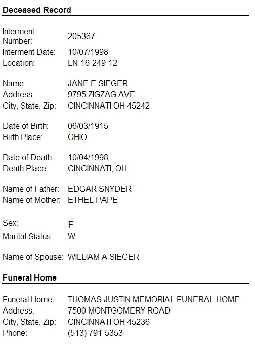Residences1912 - Ohio | 1920 - Cincinnati, Hamilton, Ohio 1930 - Green, Hamilton, Ohio 1950 - Sycamore, Hamilton, Ohio 1988 - Cincinnati, Hamilton, Ohio |