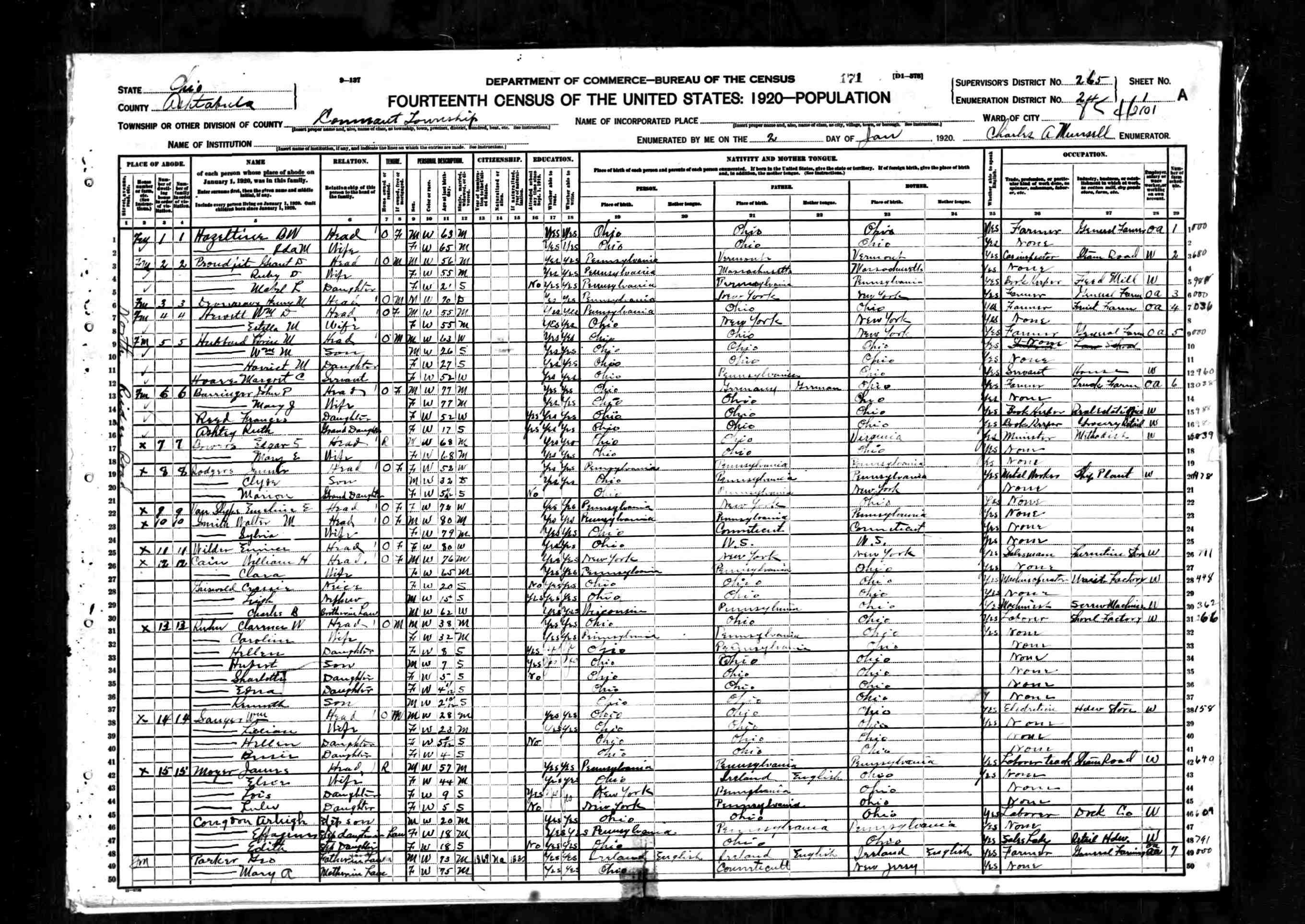 Residences1839 - Springfield, Pennsylvania | 1850 - Springfield, Erie, Pennsylvania 1860 - Springfield, Erie, Pennsylvania 1870 - De Witt, Clinton, Iowa 1880 - De Witt, Clinton, Iowa | 1900 - Kingsville, Ashtabula, Ohio | 1910 - Conneaut, Ashtabula, Ohio 1920 - Conneaut, Ashtabula, Ohio 1921 - Conneaut, Ashtabula, Ohio |