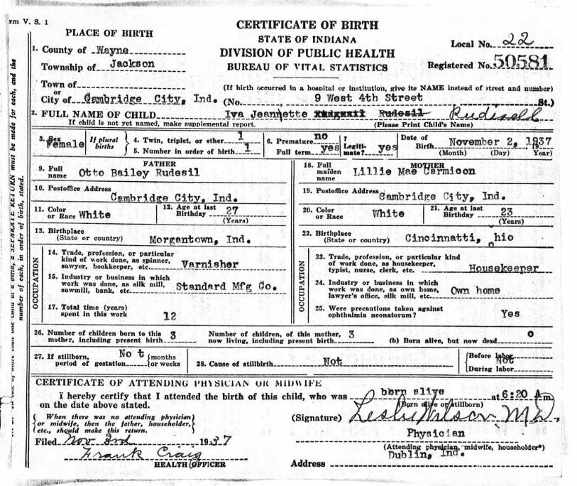 Birth Record   Cambridge City, Wayne, Indiana