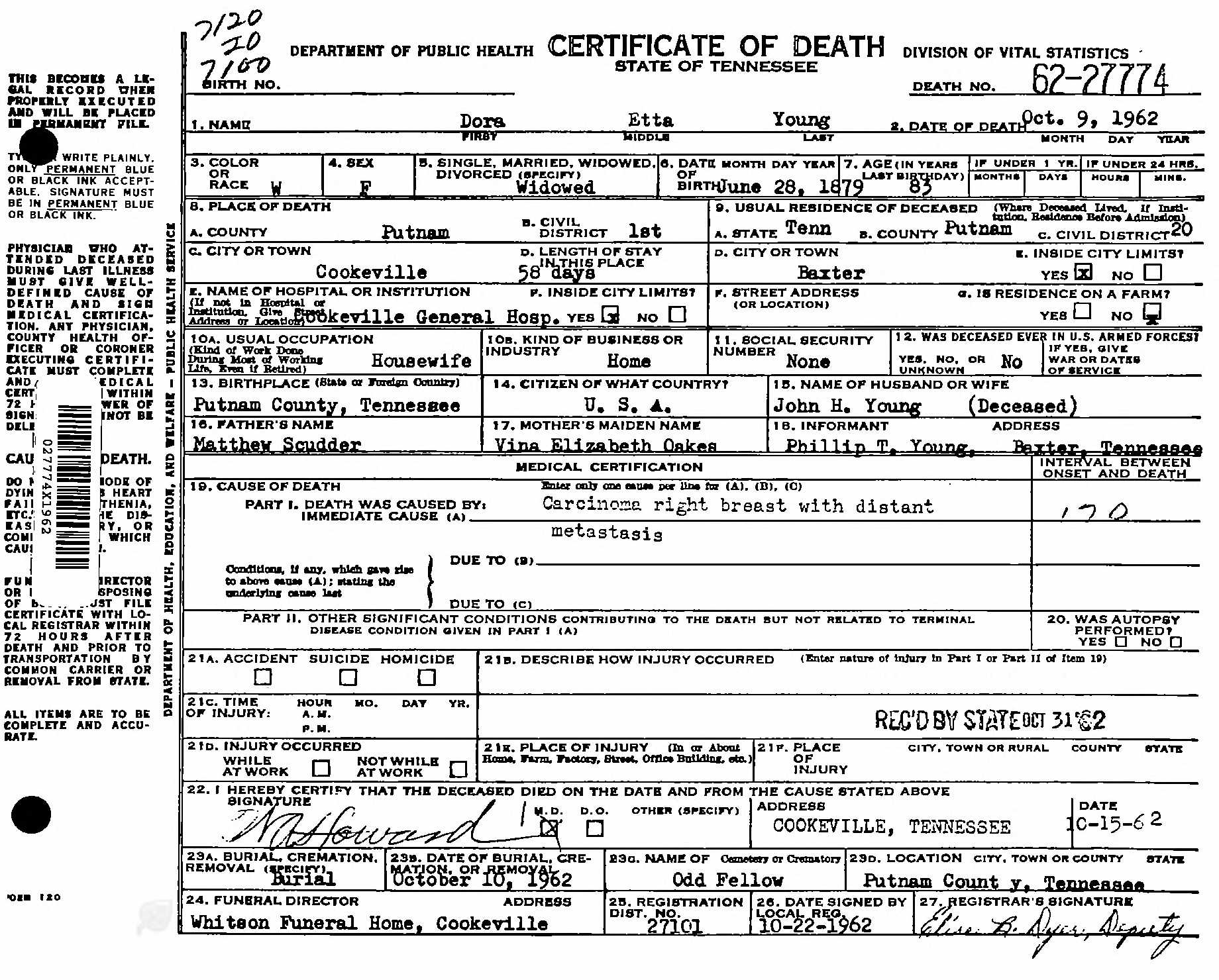 Residences1879 - Putnam County, Tennessee | 1880 - Putnam, Tennessee 1900 - Putnam, Tennessee 1910 - Cumberland, Tennessee 1920 - Baxter, Putnam, Tennessee 1962 - Cookeville, Putnam, Tennessee |