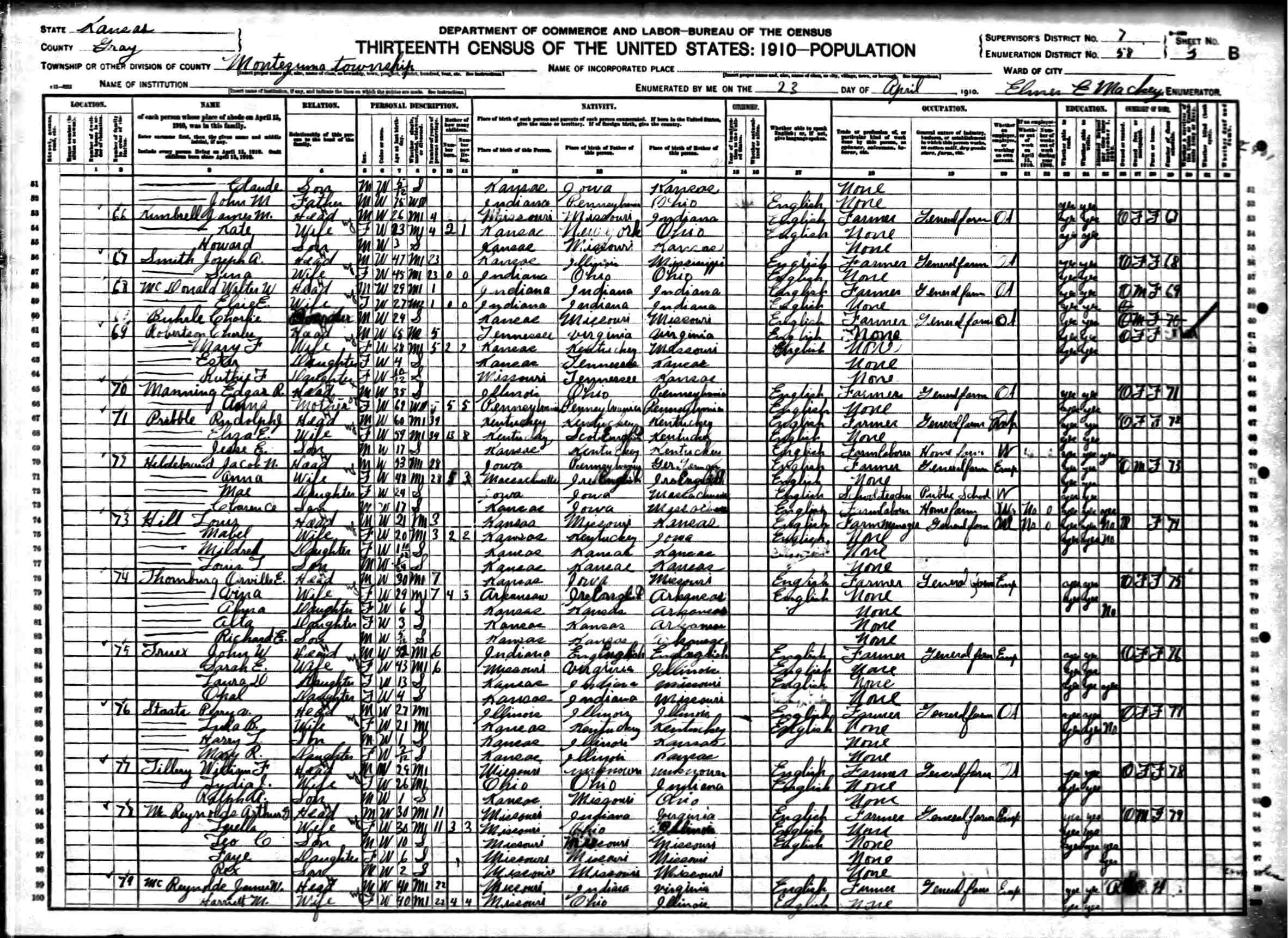 Residences1894 - Union Grove, Missouri | 1910 - Montezuma, Kansas 1920 - Montezuma, Kansas 1930 - Montezuma, Kansas |