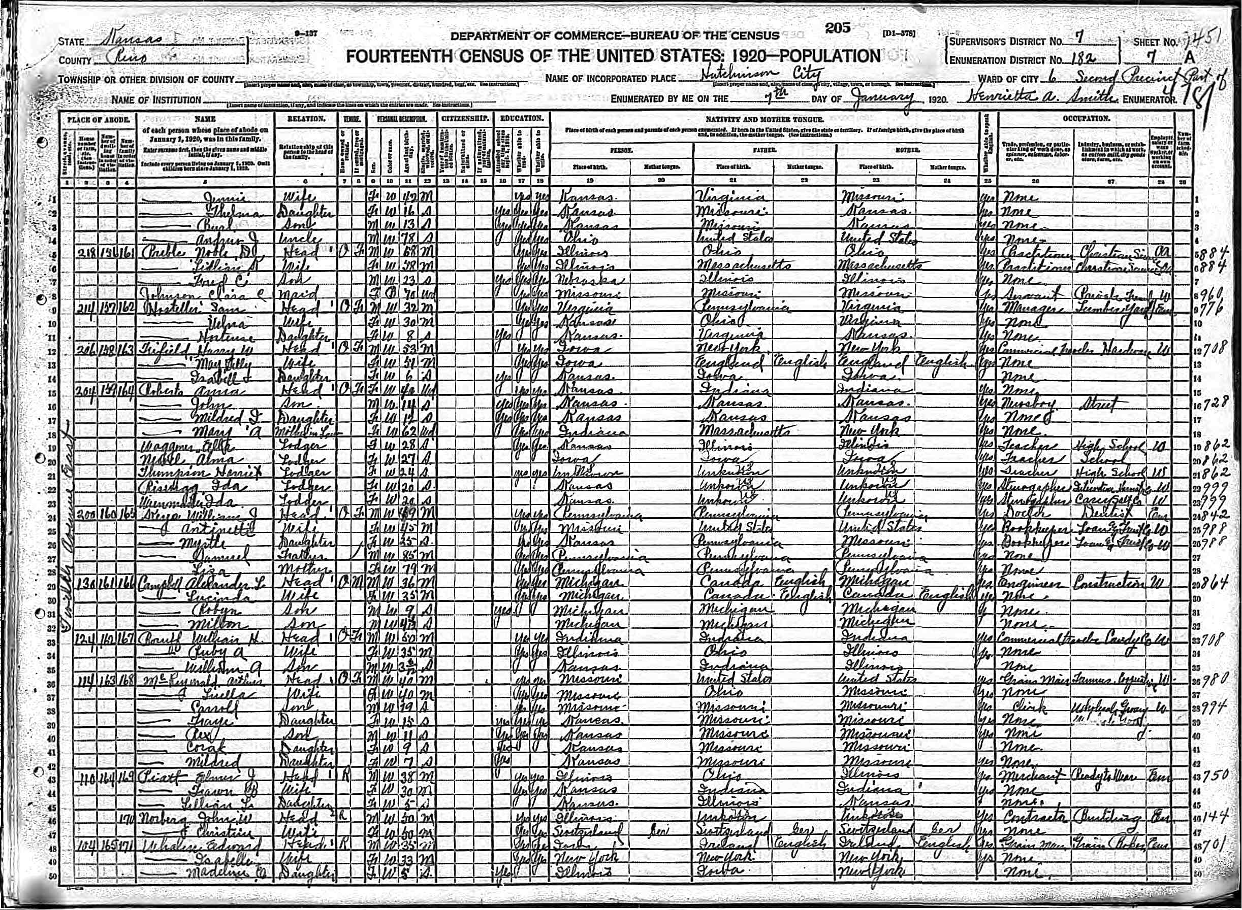 Residences1879 - Union Grove, Missouri | 1880 - Bogle, Gentry, Missouri 1900 - Middlefork, Missouri 1910 - Montezuma, Kansas 1920 - Hutchinson, Kansas |