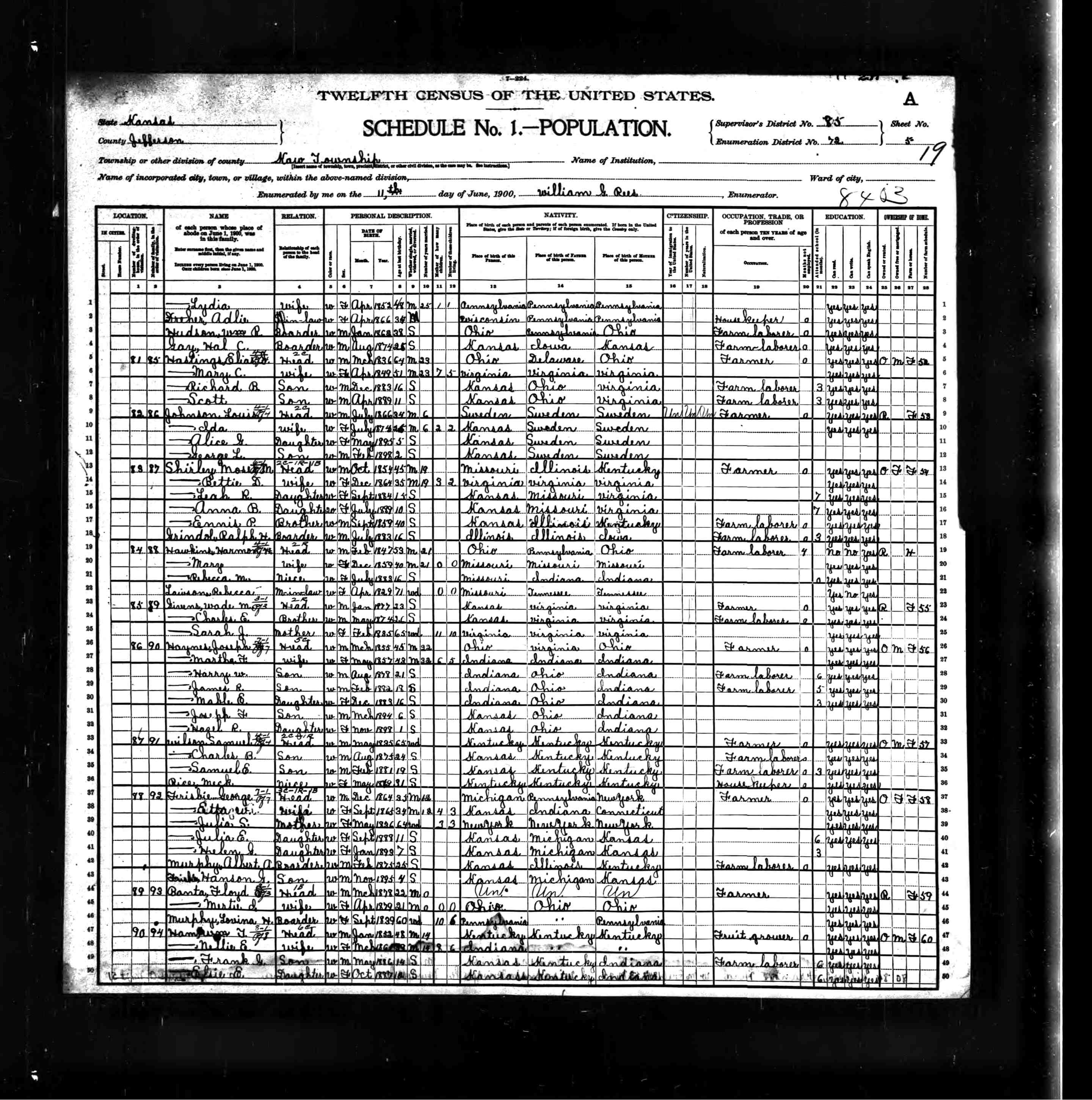 Residences1883 - Jefferson, Kansas | 1900 - Kaw, Jefferson, Kansas 1910 - Topeka, Shawnee, Kansas 1930 - Kansas City, Jackson, Missouri 1941 - Kansas City, Kansas |