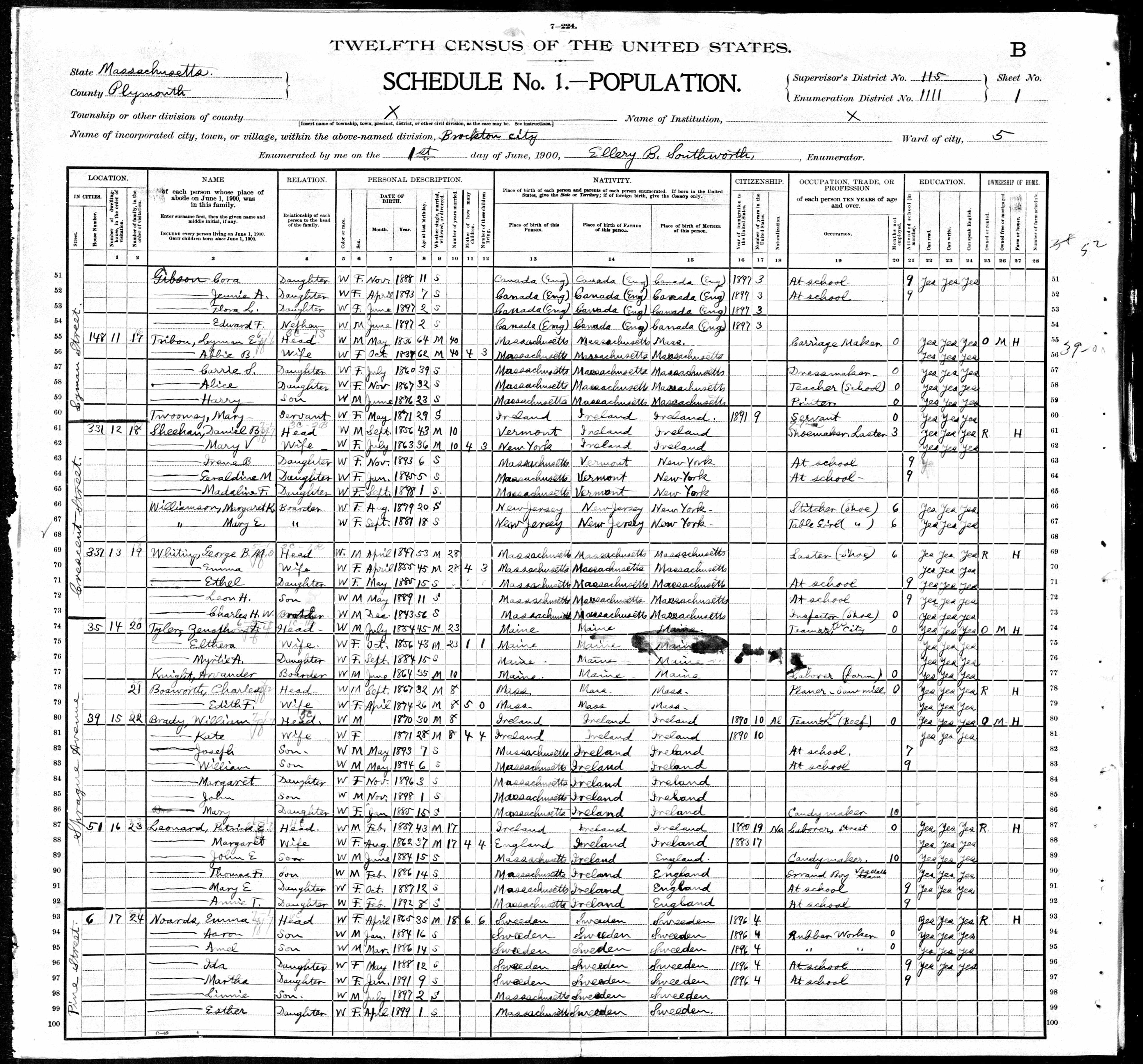 Residences1867 - Ingomar, Shelbourne, Nova Scotia, Canada | 1900 - Brockton, Plymouth, Massachusetts 1910 - Brockton, Plymouth, Massachusetts 1920 - East Bridgewater, Plymouth, Massachusetts 1930 - Eastbridgewater, Plymouth, Massachusetts 1940 - Brockton, Plymouth, Massachusetts 1960 - Brockton, Plymouth, Massachusetts |
