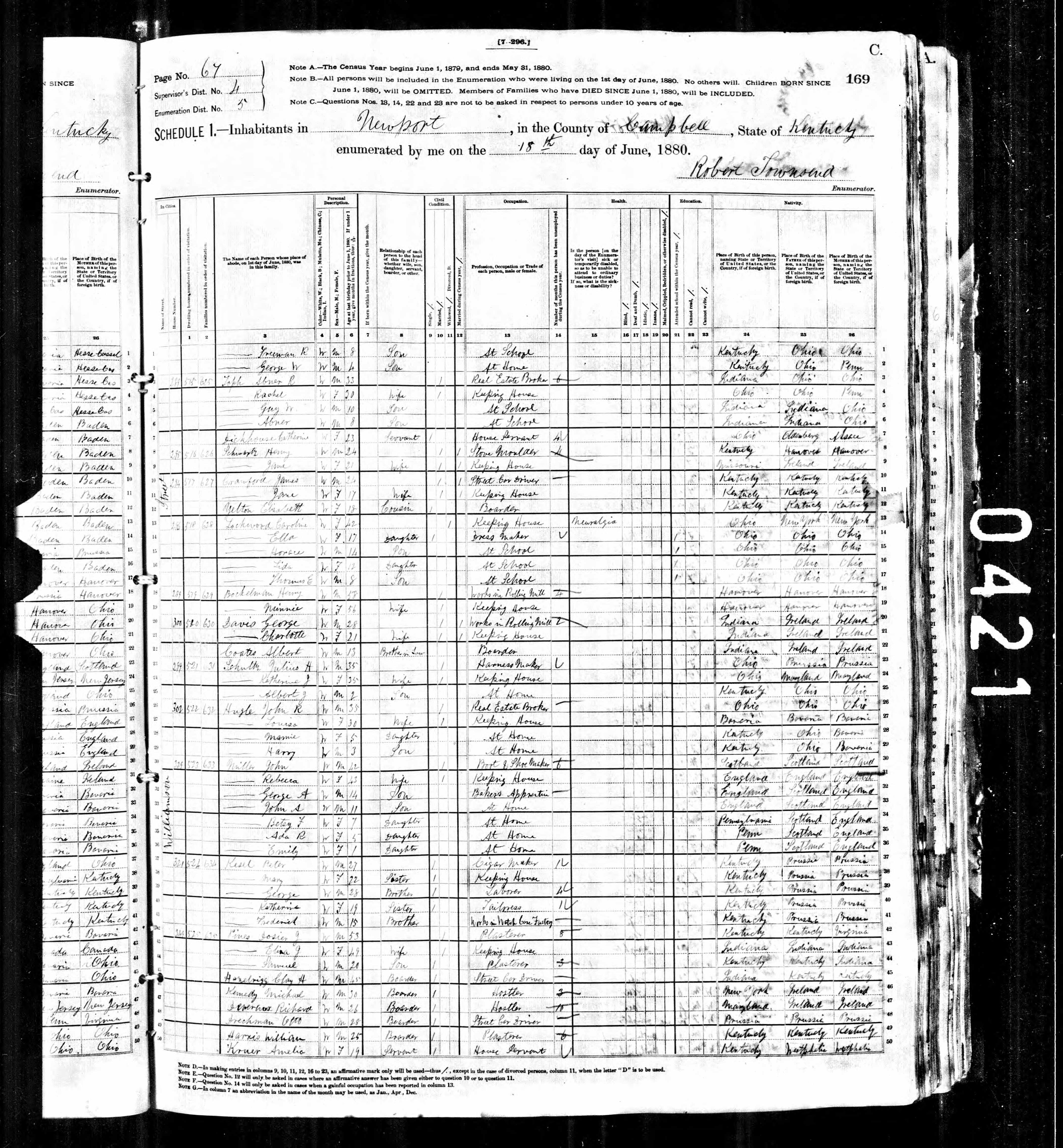 Residences1847 - Pierceville, Indiana | 1850 - Johnson, Ripley, Indiana 1860 - Johnson, Ripley, Indiana 1870 - Franklin, Ripley, Indiana 1880 - Newport, Campbell, Kentucky 1910 - Ocala, Marion, Florida |