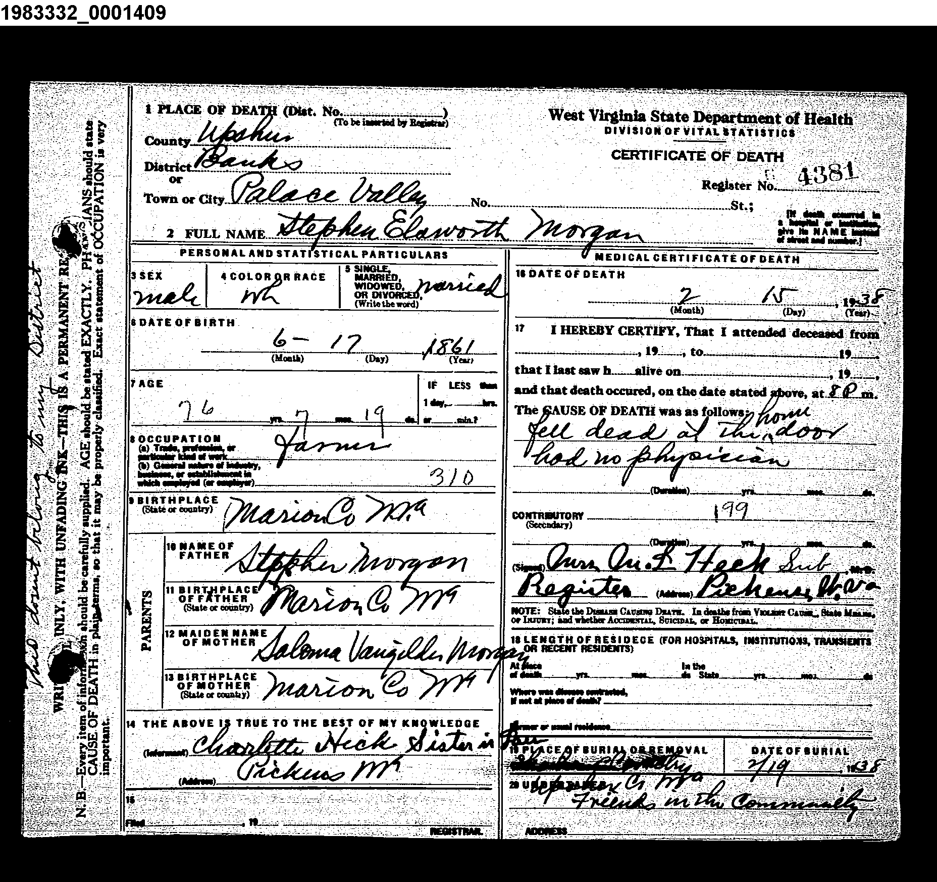 Residences1866 - New Milton, Doddridge, West Virginia | 1870 - New Milton, Doddridge, West Virginia 1880 - Meade, Upshur, West Virginia 1900 - Washington, Upshur, West Virginia 1910 - Washington, Upshur, West Virginia | 1920 - Washington, Upshur, West Virginia | 1930 - Washington, Upshur, West Virginia 1940 - Washington, Upshur, West Virginia 1957 - Elkins, Randolph, West Virginia |