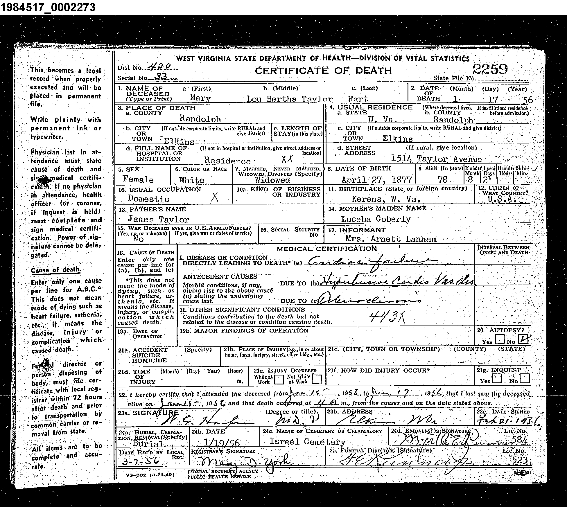 James Taylor Brown Hart - Mary Lou Bertha Taylor