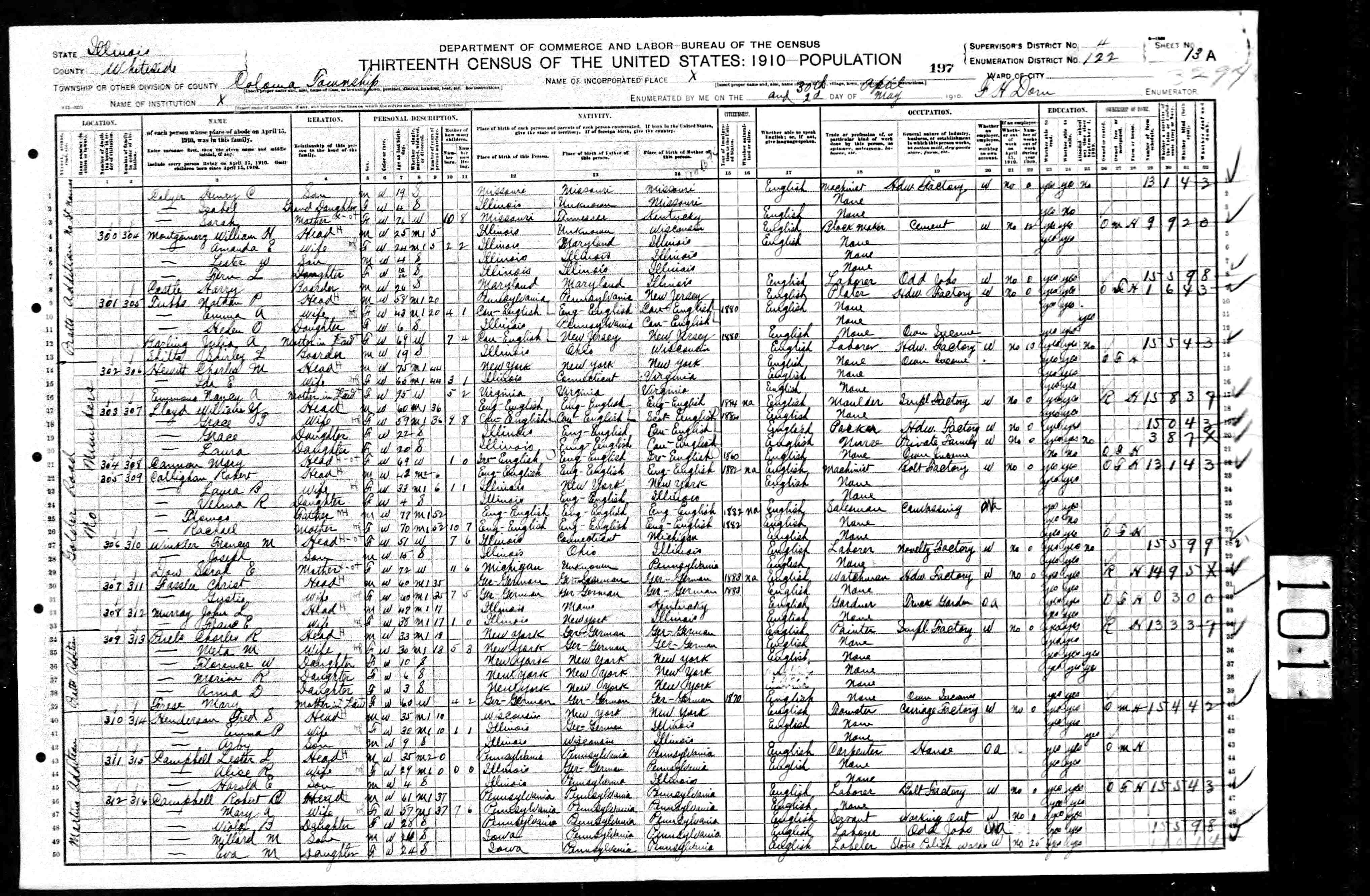 Residences1814 - Virginia | 1850 - Whiteside, Illinois 1860 - Newton, Whiteside, Illinois 1870 - Rock Falls, Whiteside, Illinois 1880 - Rock Falls, Whiteside, Illinois 1910 - Coloma, Whiteside, Illinois 1910 - Rock Falls, Illinois |