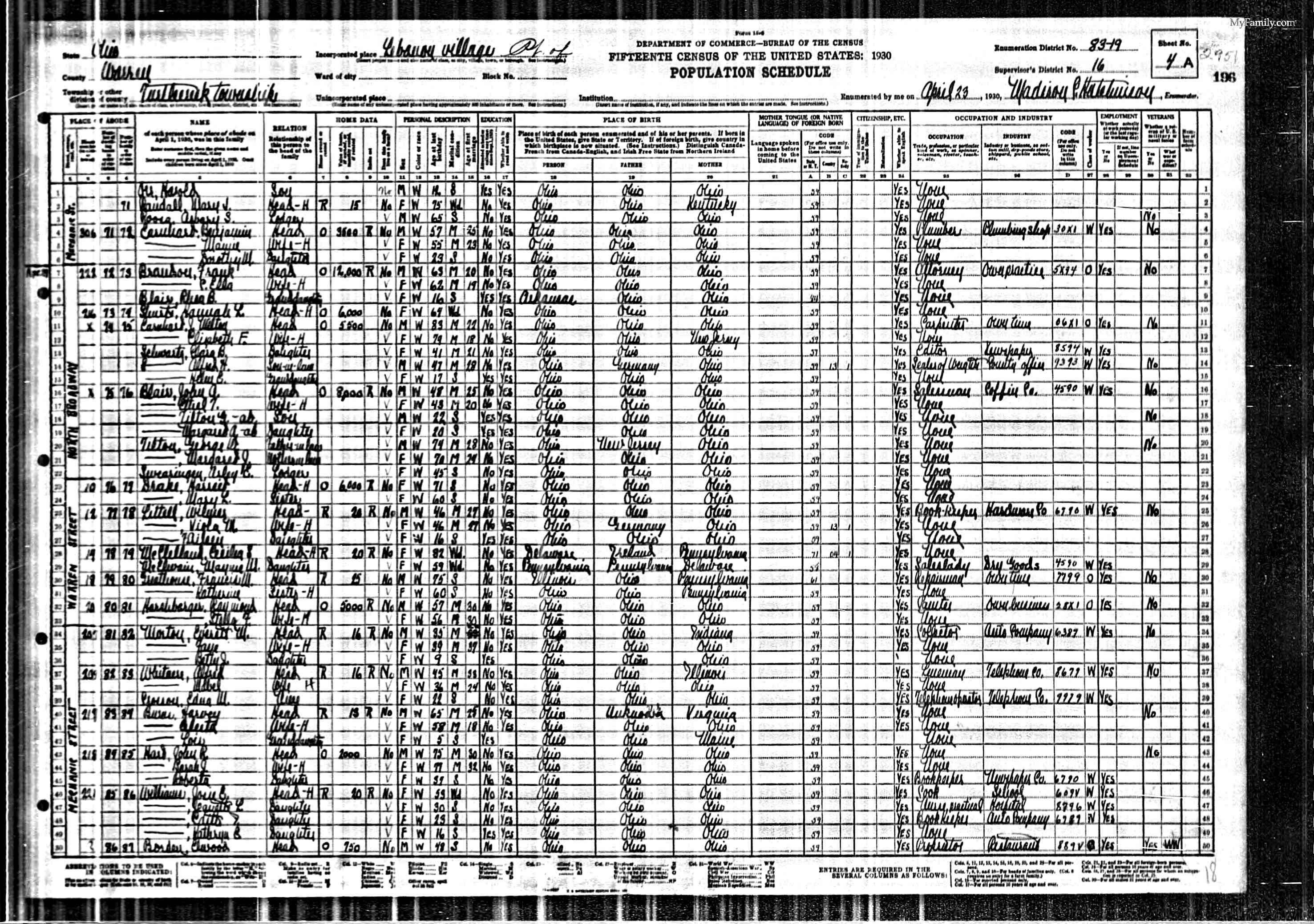 1930 - Lebanon, Warren, Ohio