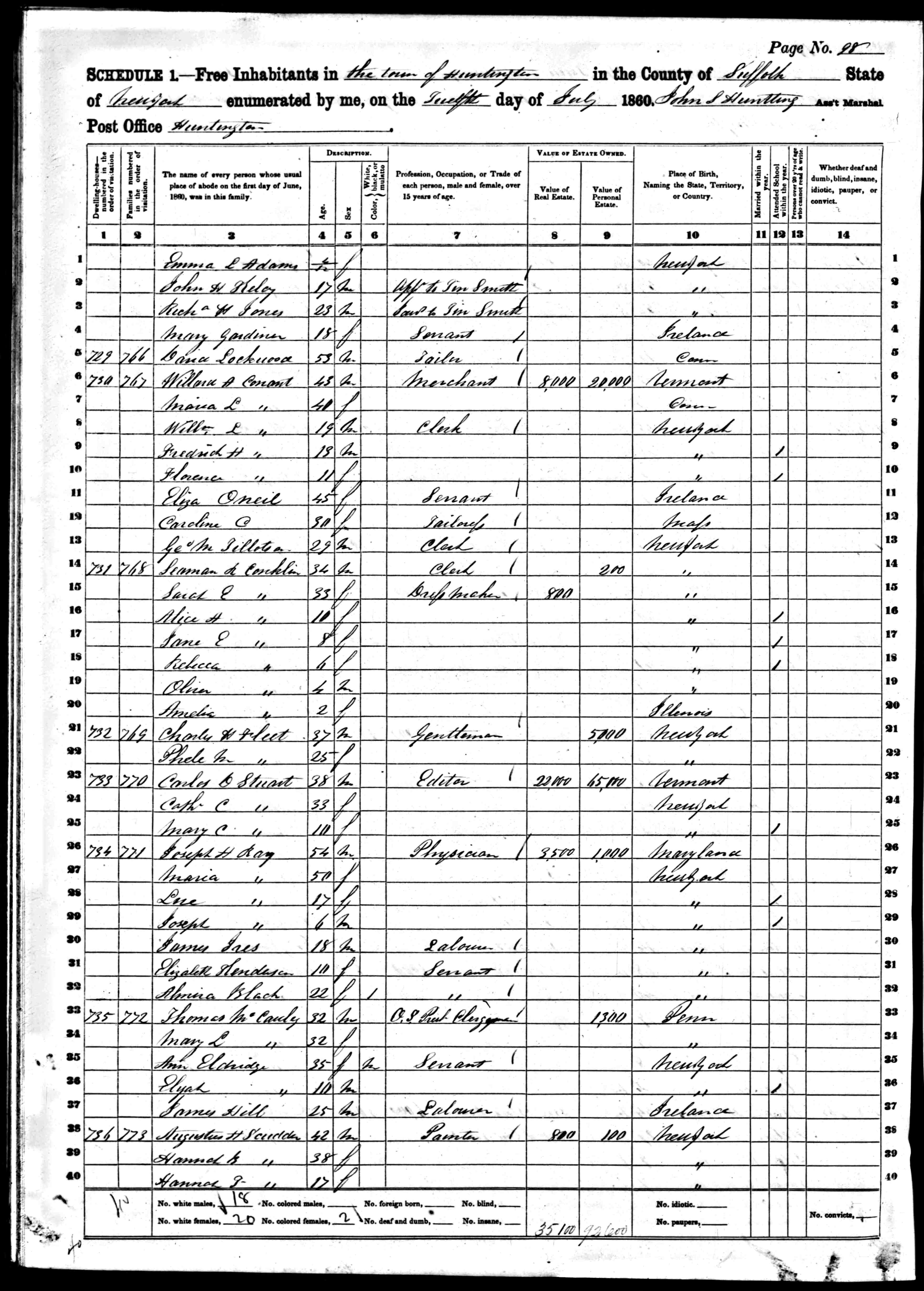 Residences1853 - Oyster Bay, New York | 1860 - Huntington, Suffolk, New York 1870 - Huntington, Suffix, New York 1880 - Huntington, Suffolk, New York 1900 - Huntington, Suffolk, New York | 1910 - Huntington, Suffolk, New York | 1920 - Huntington, Suffolk, New York 1930 - Huntington, Suffolk, New York 1933 - Huntington, Suffolk, New York |