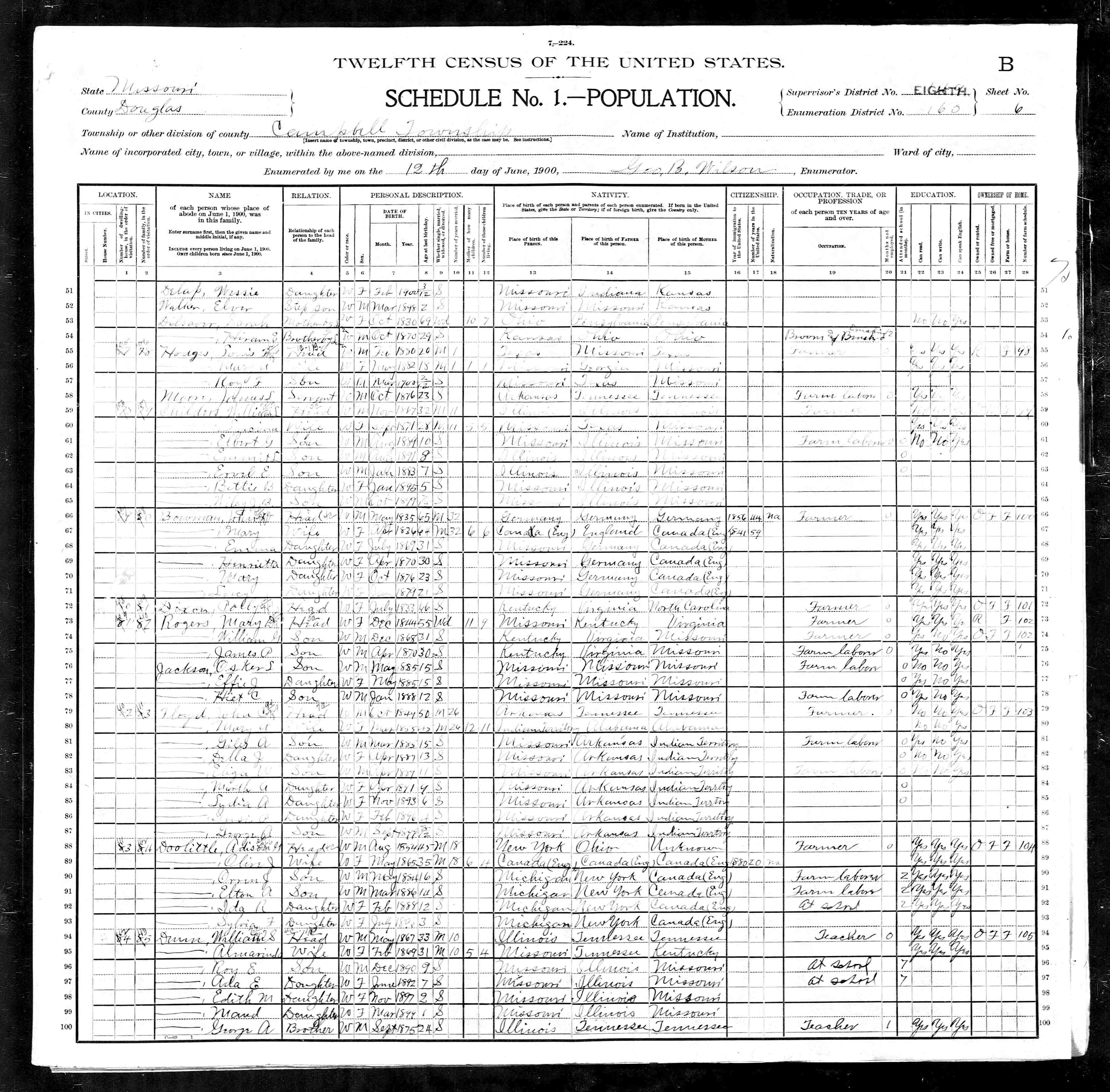 Residences1854 - New York | 1860 - Gouverneur, St Lawrence, New York 1870 - Macomb, St Lawrence, New York 1880 - Burt, Cheboygan, Michigan 1900 - Campbell, Douglas, Missouri | 1910 - Tyler, Texas | 1920 - Harris, Texas 1930 - Harris, Texas 1936 - Houston, Harris,Texas |