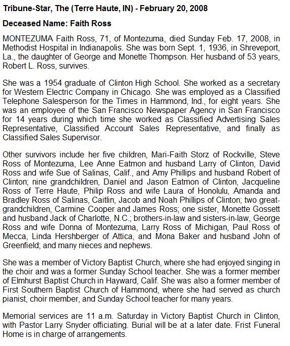Residences1936 - Shreveport, Caddo, Louisiana | 1940 - Gregg, Texas 2008 - Montezuma, Parke, Indiana |