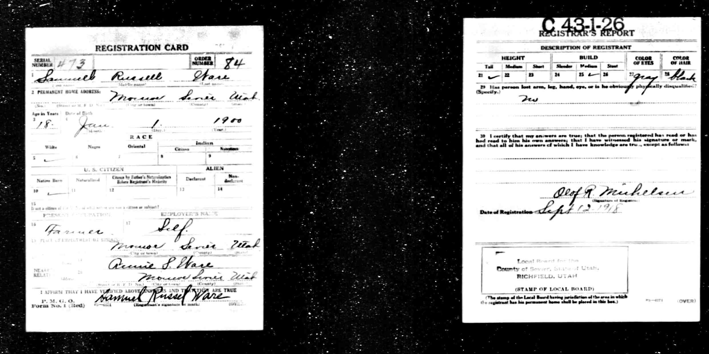 Residences1901 - Koosharem, Utah | 1910 - Koosharem, Sevier, Utah 1920 - Monroe, Sevier, Utah 1930 - Monroe, Sevier, Utah 1940 - Monroe, Sevier, Utah 1985 - Monroe, Utah |