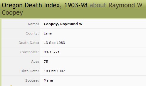 Residences1900 - Valley, Minnesota | 1910 - Eugene, Lane, Oregon 1920 - Eugene, Lane, Oregon 1980 - Portland, Multnomah, Oregon |