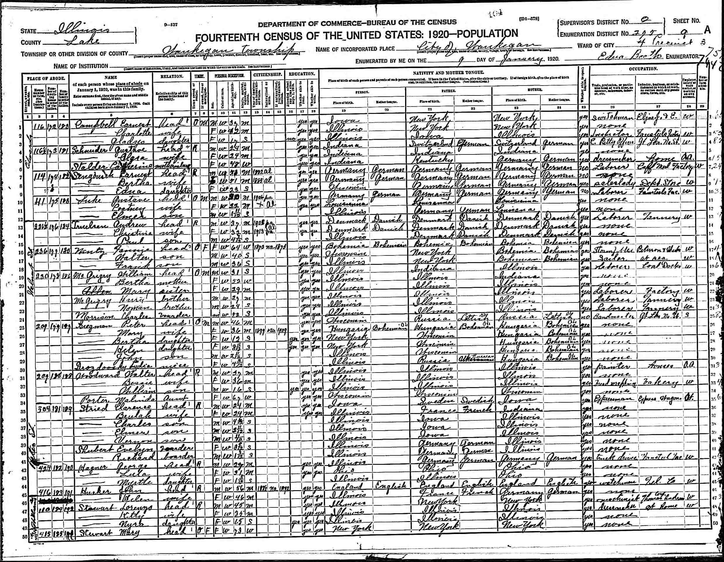 Residences1839 - New York | 1850 - Richland, Oswego, New York 1860 - Pleasant Prairie, Kenosha, Wiscosin 1880 - Antioch, Lake, Illinois | 1900 - Waukegan, Lake, Illinois | 1910 - Waukegan, Lake, Illinois 1920 - Waukegan, Lake, Illinois 1930 - Waukegan, Lake, Illinois |