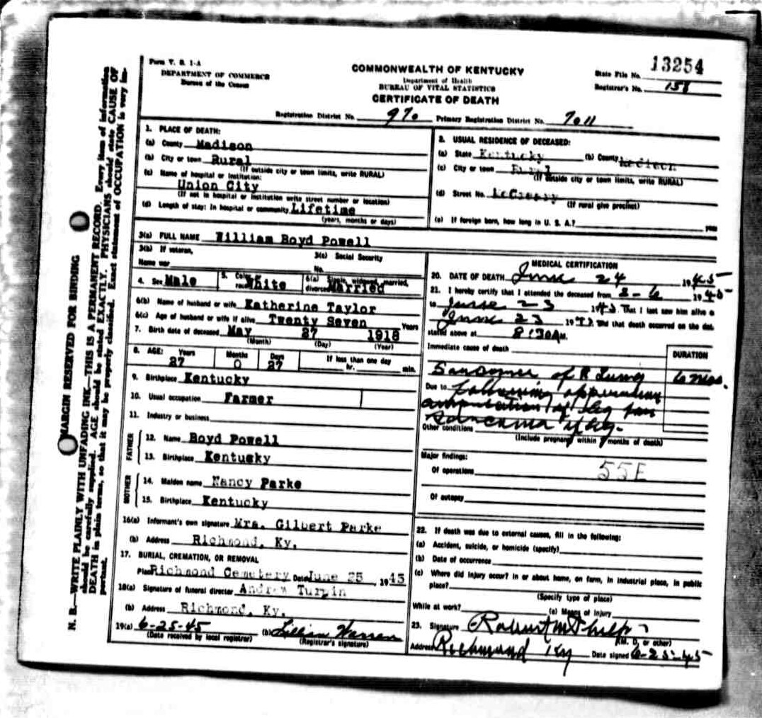 Residences1918 - Madison, Kentucky | 1920 - Mc Creary, Madison, Kentucky 1930 - Union, Madison, Kentucky 1945 - Union City, Kentucky |