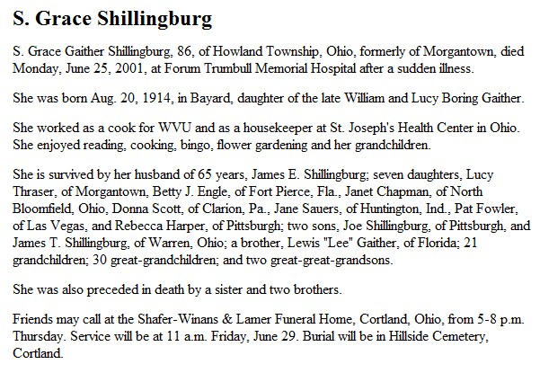 Residences1914 - Bayard, West Virginia | 1920 - Bayard, Grant, West Virginia 1930 - Bayard, Grant, West Virginia 2001 - Warren, Trumbull, Ohio |