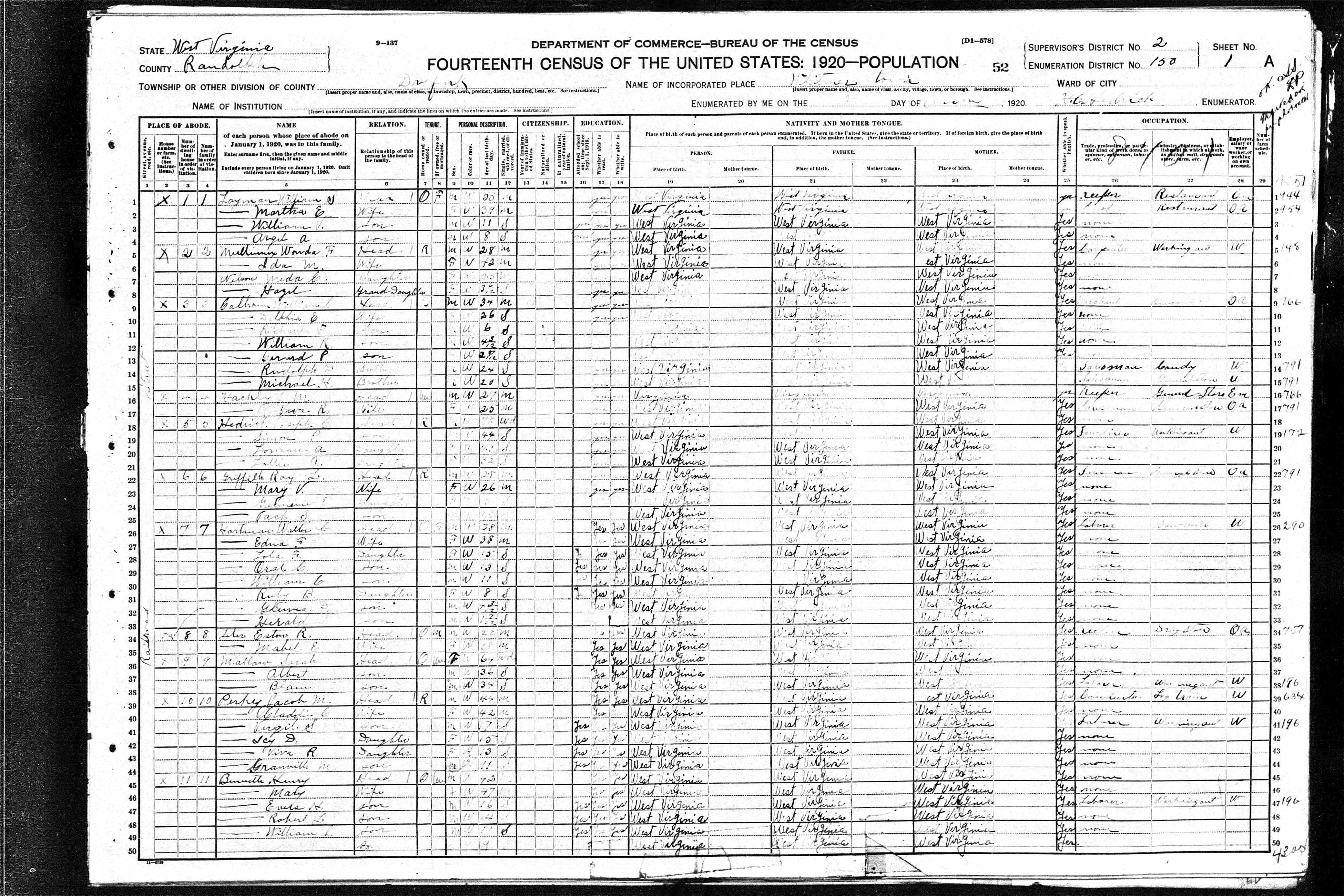 Residences1891 - Black Fork, West Virginia | 1900 - Black Fork, Tucker, West Virginia 1910 - Black Fork, Tucker, West Virginia 1920 - Dry Fork, Randolph, West Virginia 1930 - Hambleton, Tucker, West Virginia 1948 - Parsons, Tucker, West Virginia |
