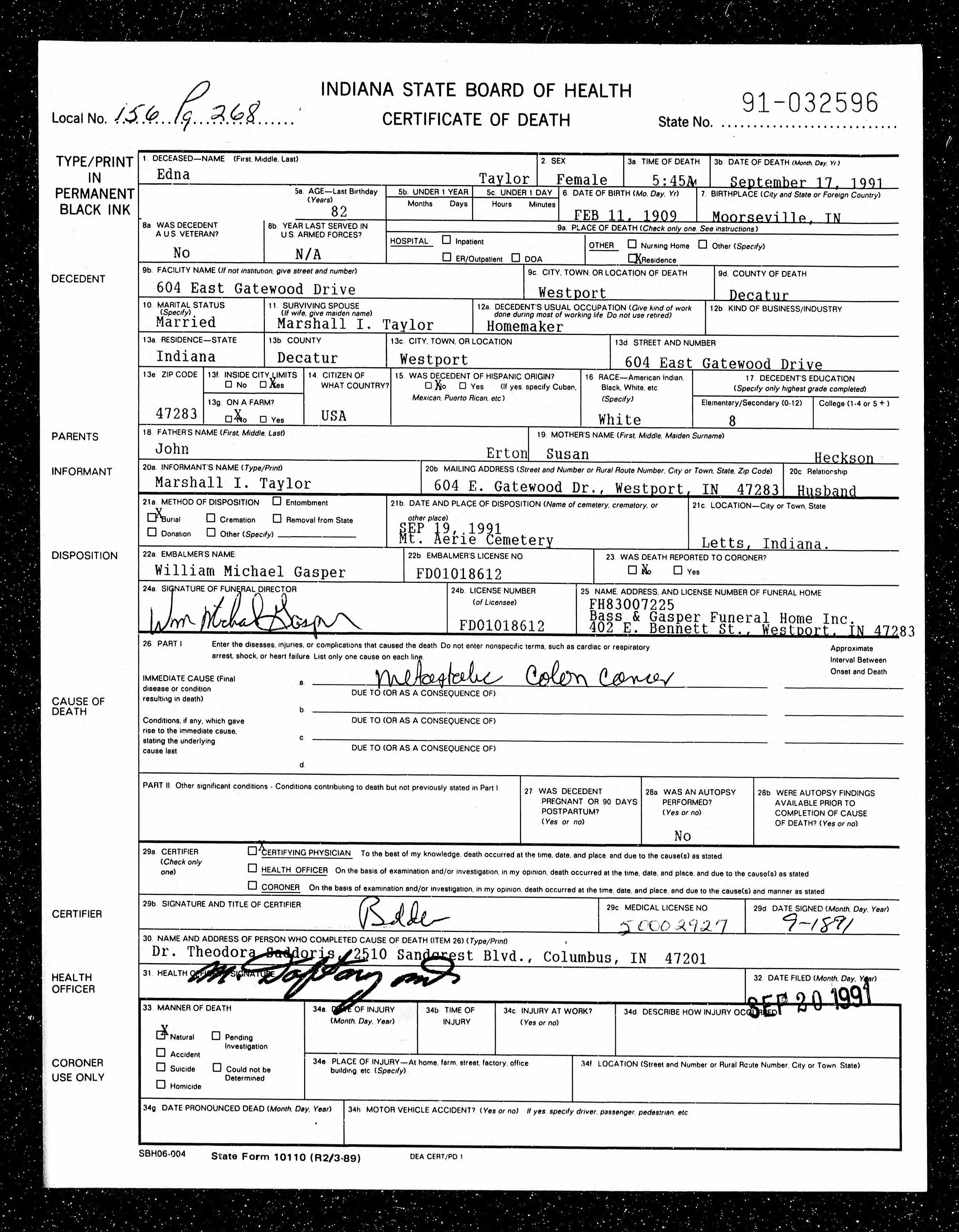Residences1909 - Franklin, Indiana | 1910 - Richland, Rush, Indiana 1930 - Greenwood, Johnson, Indiana 1940 - Sand Creek, Decatur, Indiana 1996 - Westport, Decatur, Indiana, USA |