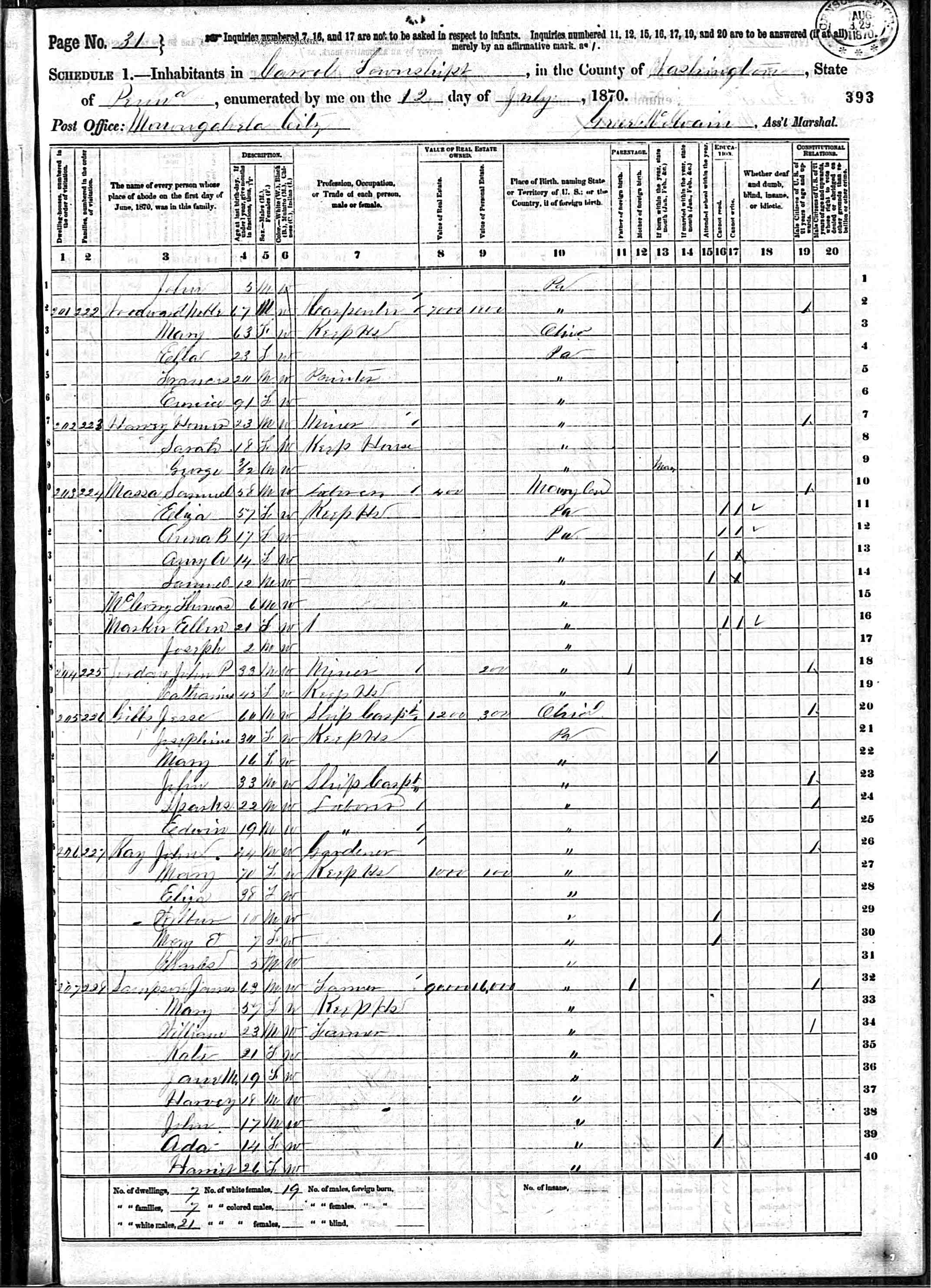 Residences1855 - Pennsylvania | 1860 - Carroll, Washington, Pennsylvania 1870 - Carroll, Washington, Pennsylvania 1880 - Carroll, Washington, Pennsylvania 1900 - Pittsburg, Allegheny, Pennsylvania 1910 - Pittsburg, Allegheny, Pennsylvania 1920 - North Huntingdon, Westmoreland, Pennsylvania |