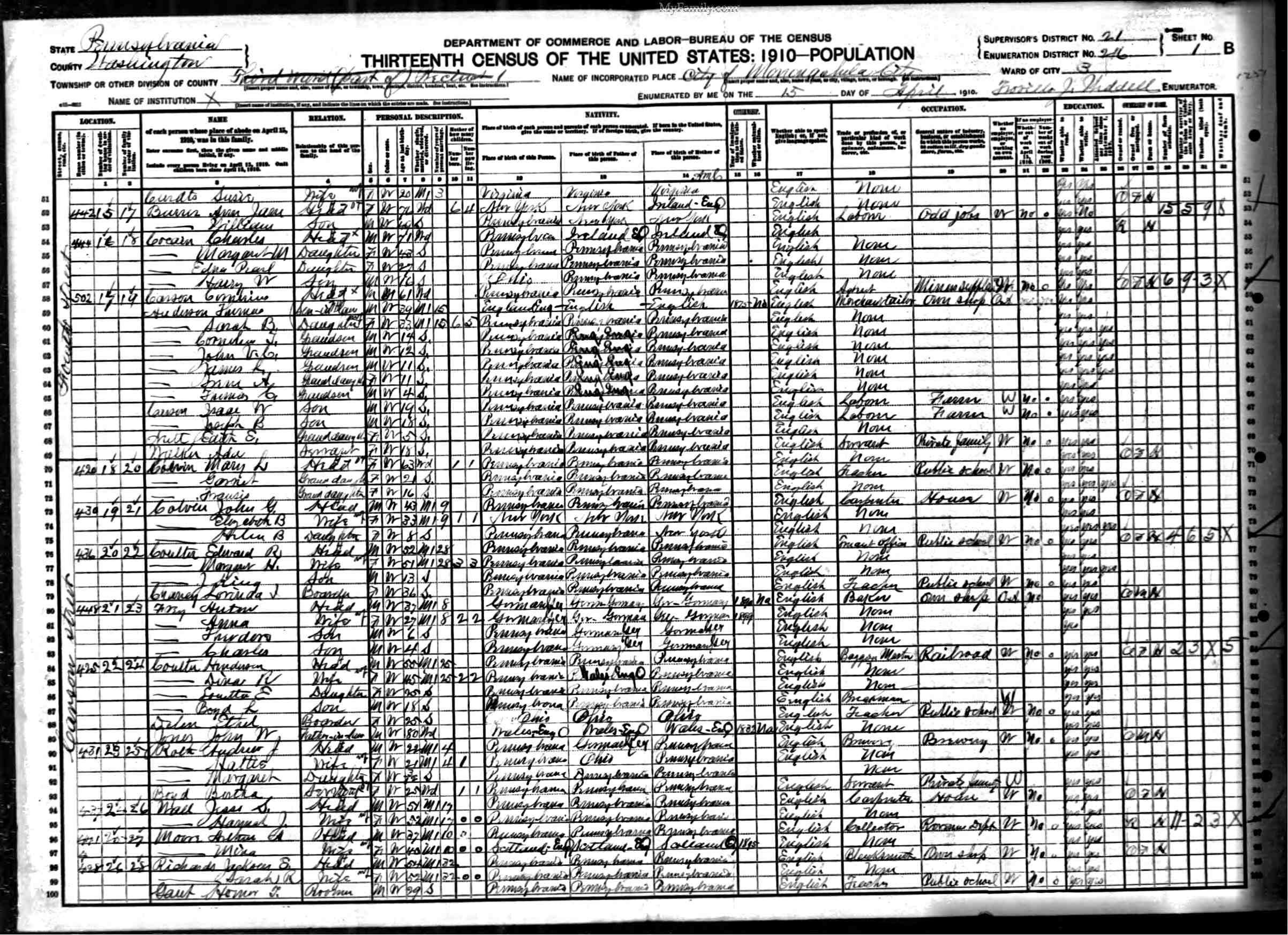 Residences1865 - Illinois | 1870 - Fallowfield, Washington, Pennsylvania 1880 - Fallowfield, Washington, Pennsylvania 1900 - Monongahela, Washington, Pennsylvania 1910 - Monongahela, Washington, Pennsylvania 1920 - Monongahela, Washington, Pennsylvania |