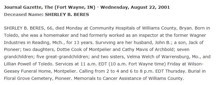 Residences1935 - Toledo, Lucas, Ohio | 1940 - Adams, Lucas, Ohio 2001 - Montpelier, Williams, Ohio |