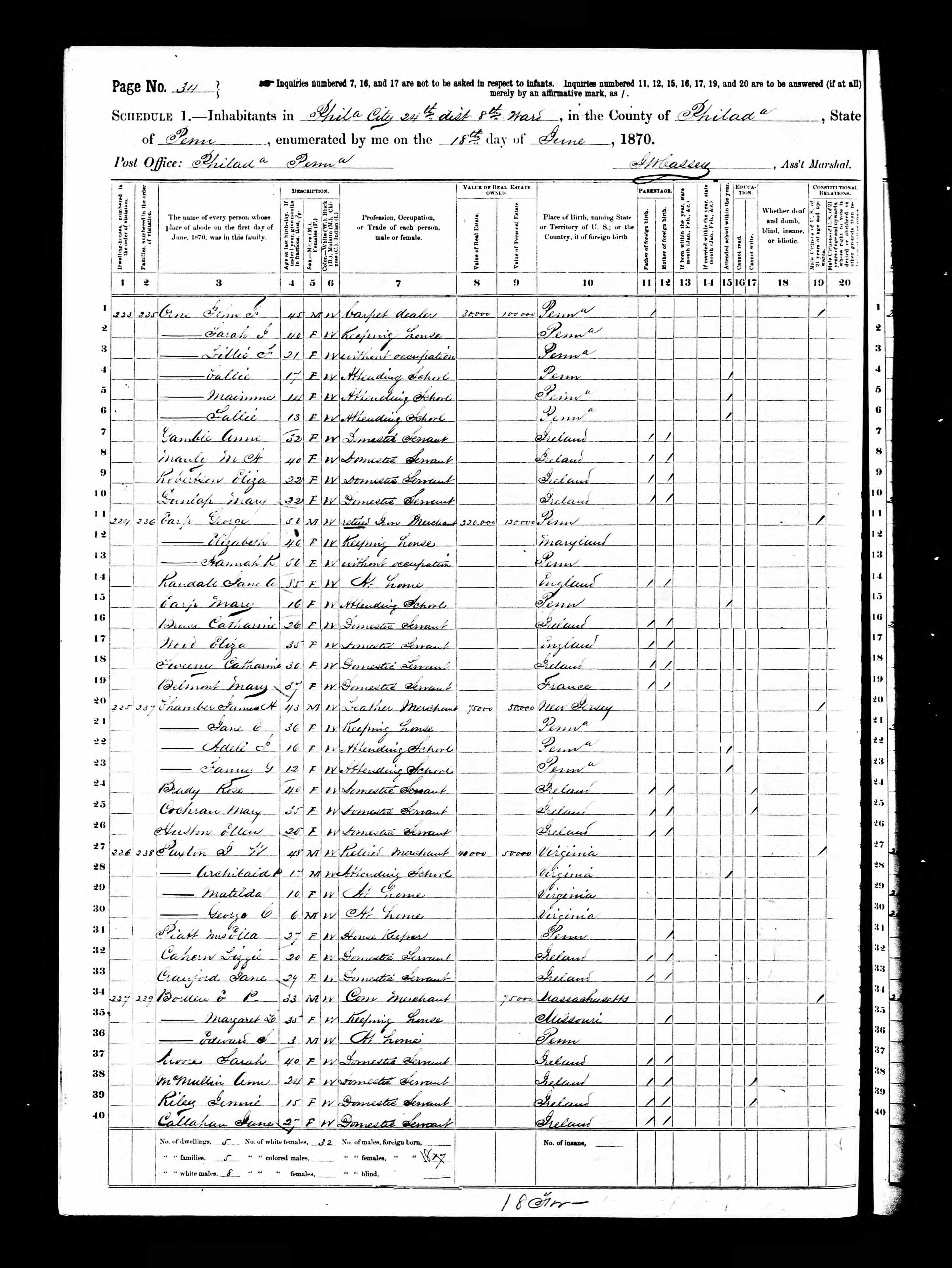 Residences1867 - Pennsylvania | 1870 - Philadelphia, Philadelphia, Pennsylvania 1880 - Philadelphia, Philadelphia, Pennsylvania 1900 - Philadelphia, Philadelphia, Pennsylvania 1910 - Upper Providence, Delaware, Pennsylvania | 1920 - Upper Providence, Delaware, Pennsylvania | 1930 - Upper Providence, Delaware, Pennsylvania 1940 - Upper Providence, Delaware, Pennsylvania 1951 - Media, Delaware, Pennsylvania |