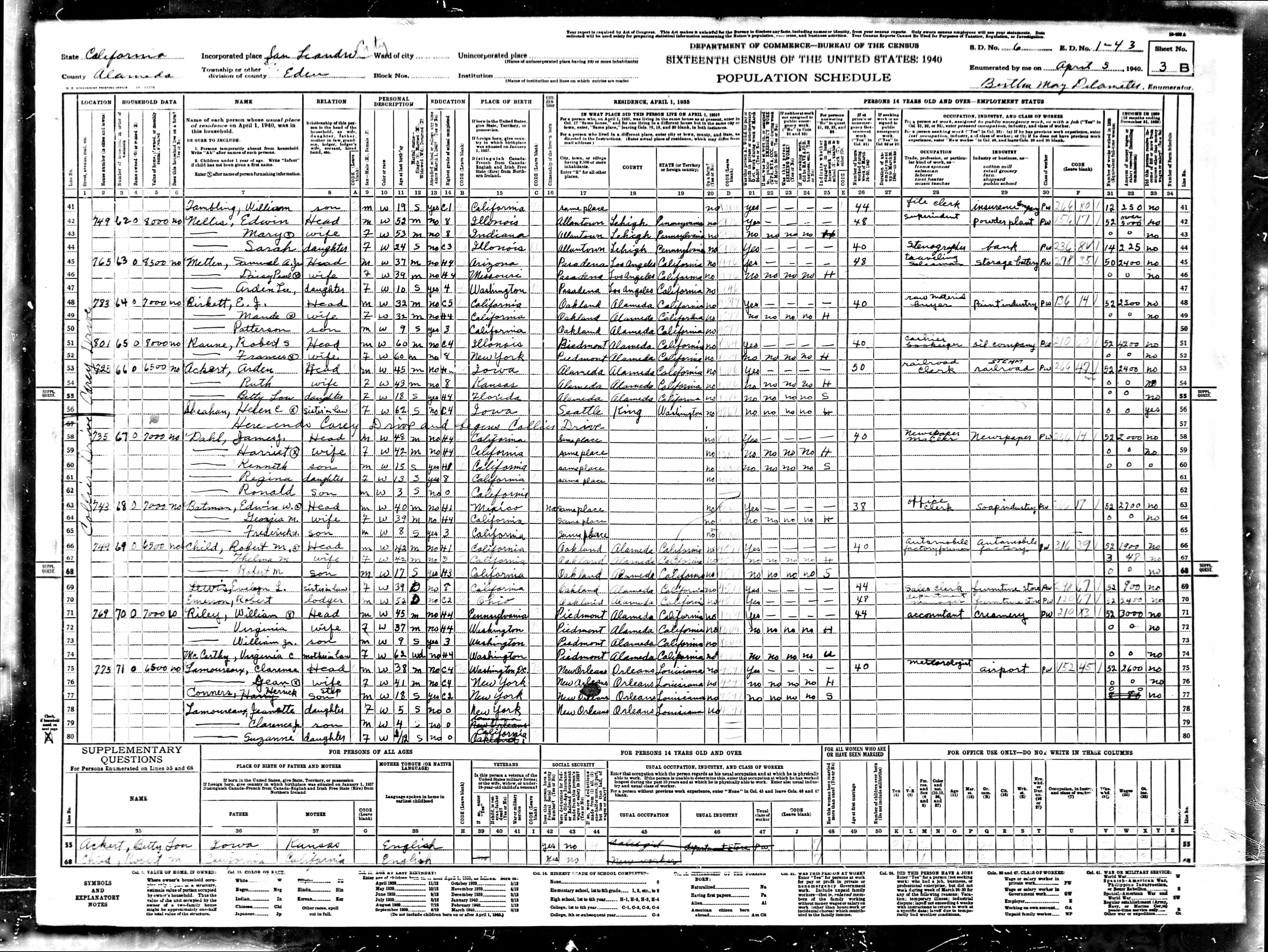 Residences1901 - California | 1910 - San Jacinto, Riverside, California 1920 - San Jacinto, Riverside, California 1930 - Oakland, Alameda, California 1940 - San Leandro, Alameda, California 1987 - , San Bernardino, San Bernardino, California, USA |