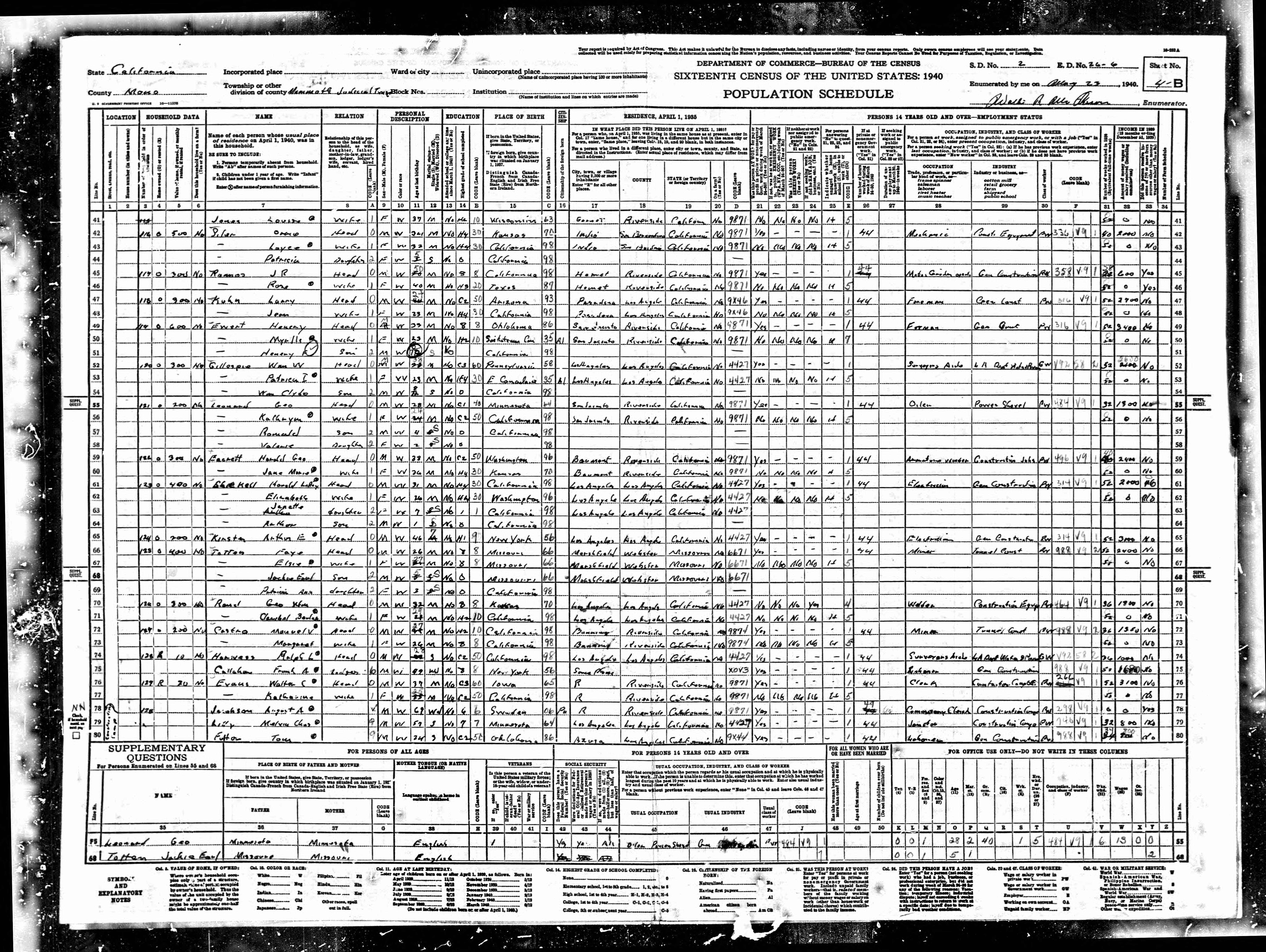 Residences1908 - Los Angeles County, California | 1910 - Bergman, Riverside, California 1920 - Hemet, Riverside, California 1940 - Mammoth, Mono, California 1950 - Burbank, Los Angeles, California 1976 - , Burbank, Los Angeles, California, USA |