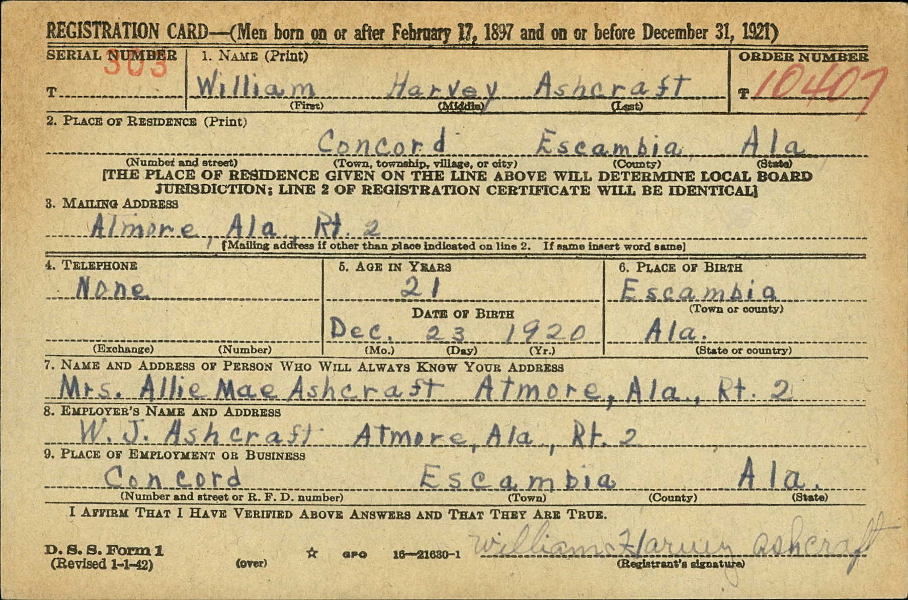 Residences1920 - Atmore, Escambia, Alabama | 1930 - Jack Springs, Escambia, Alabama 1940 - Jack Springs, Escambia, Alabama 2012 - Atmore, Escambia, Alabama |